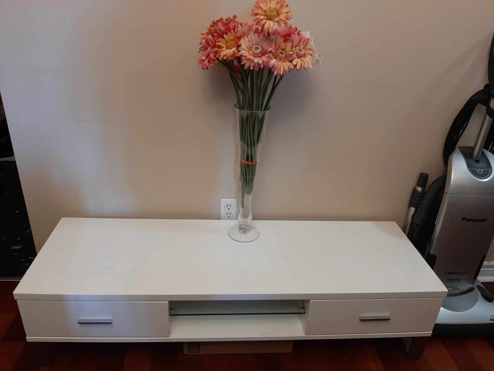 This TV stand is a modern and sleek piece of furniture, perfect for any living room. includes two drawers and a glass shelf.