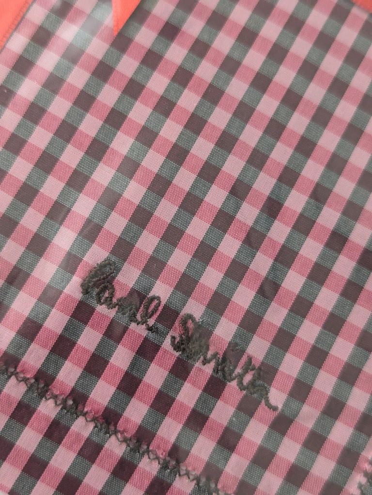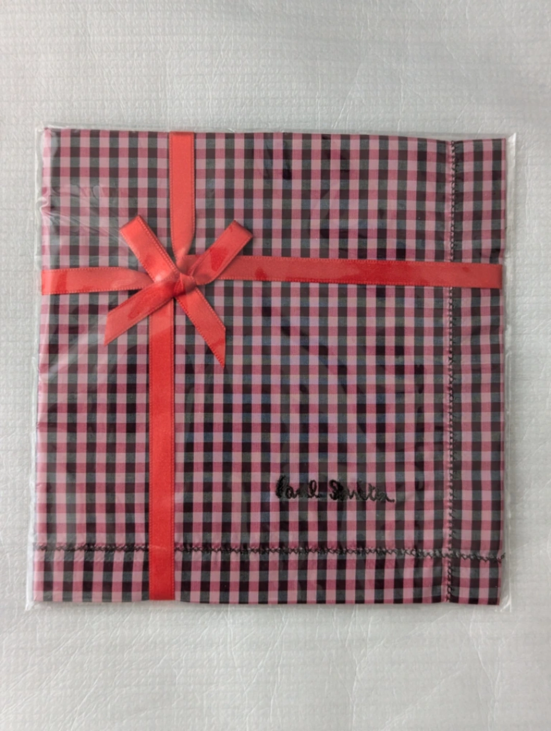 A red and black gingham handkerchief wrapped in red ribbon. Paul Smith logo embroidered on one corner. The handkerchief is completely new and still in a plastic bag. Authentic. It was a gift never used.