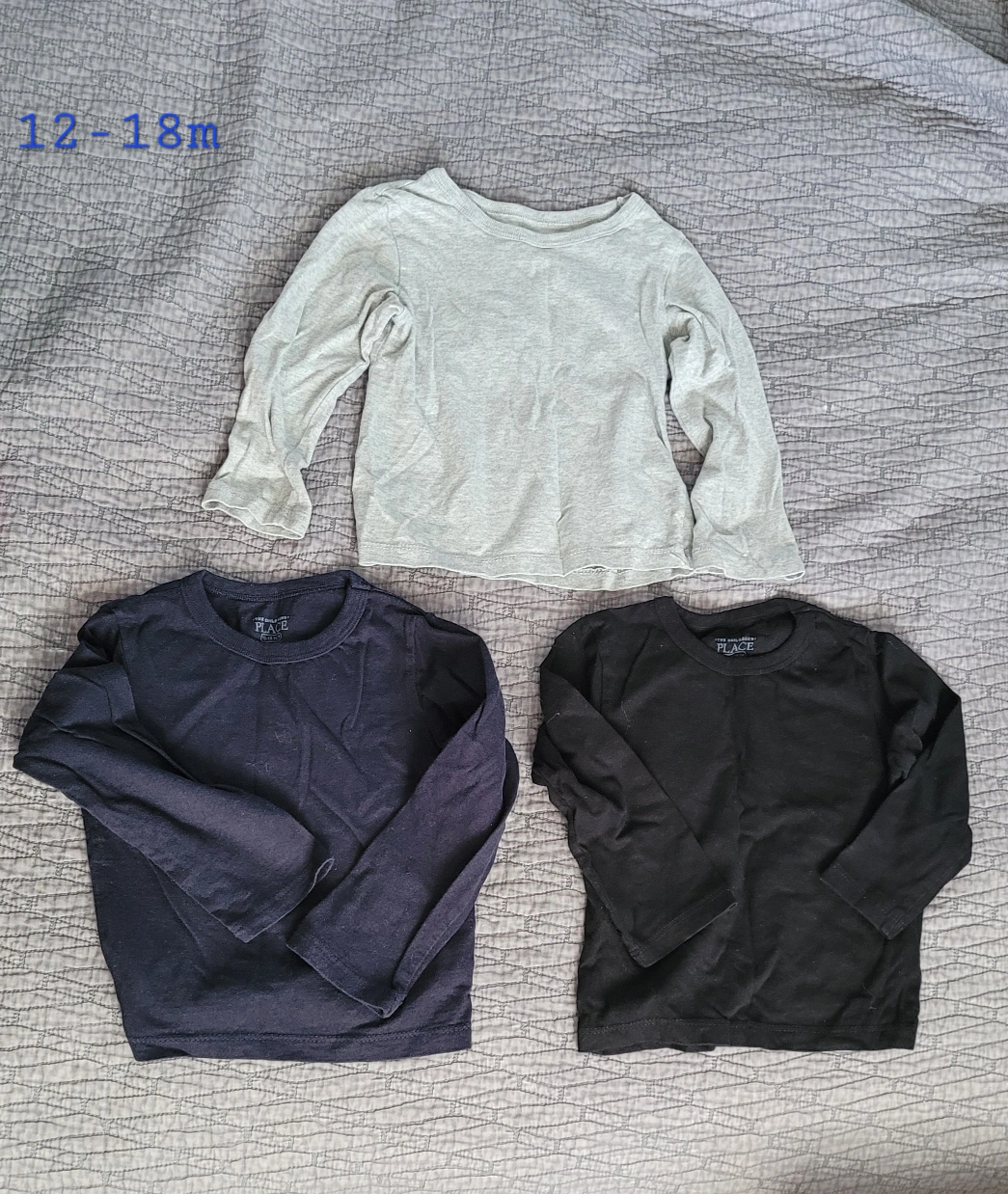 Three long-sleeved shirts, size 12-18 months. One grey, one navy, and one black. All shirts are in great condition.