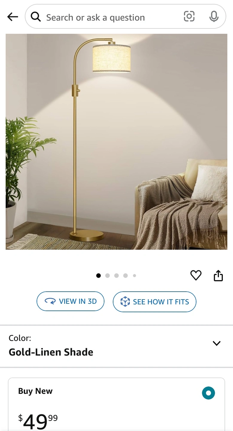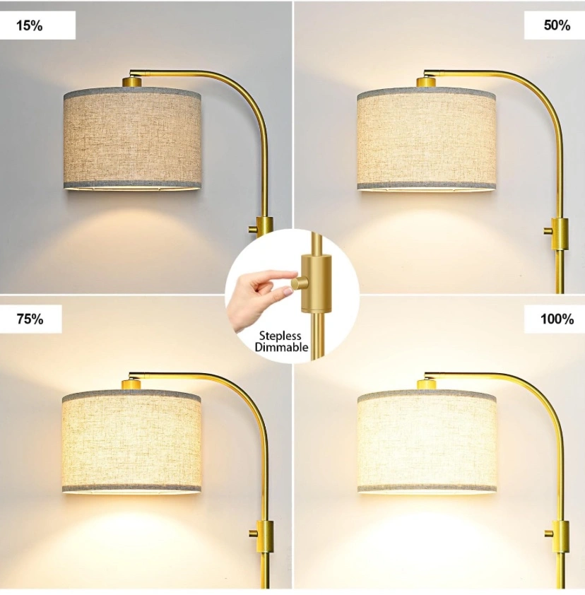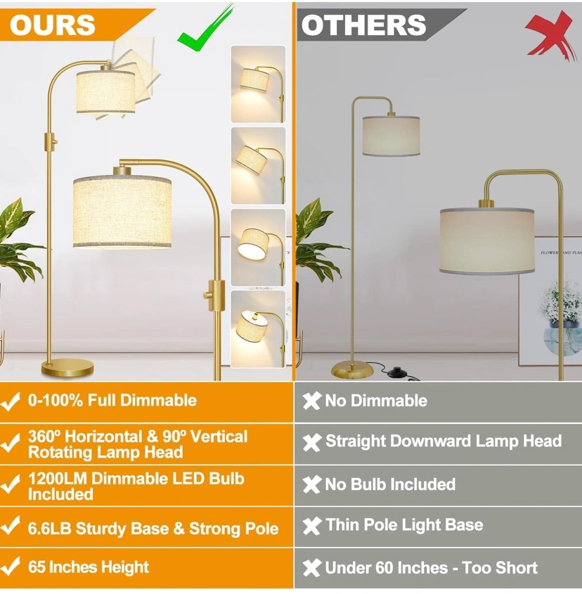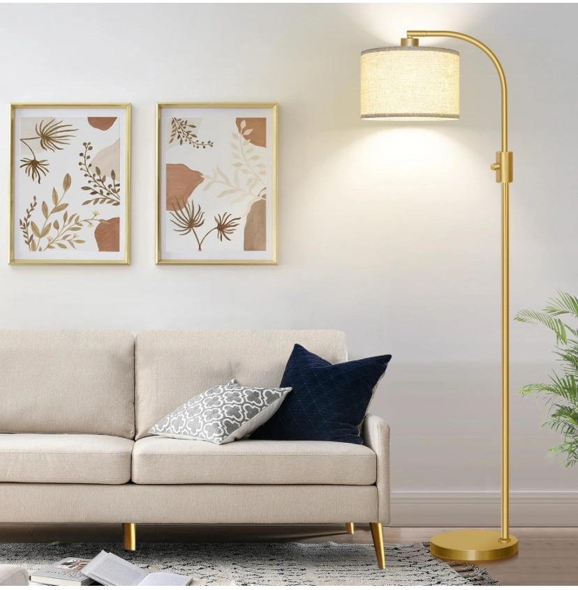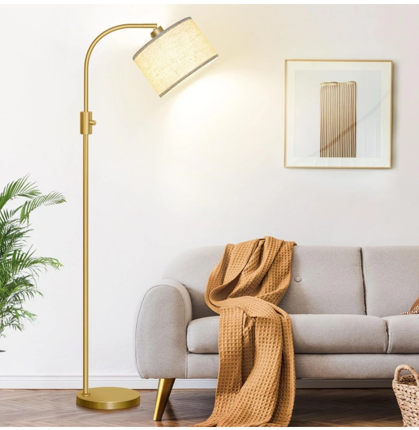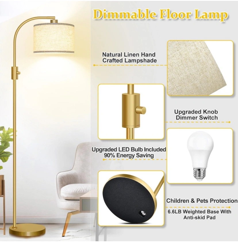 A gold floor lamp with a fabric shade. It includes a light bulb and is dimmable with a knob dimmer switch. The lamp is 65 inches tall and has a wide, weighted base. The lamp head is 360° horizontally and 90° vertically adjustable. The lamp shade is made of natural linen. - Brand New