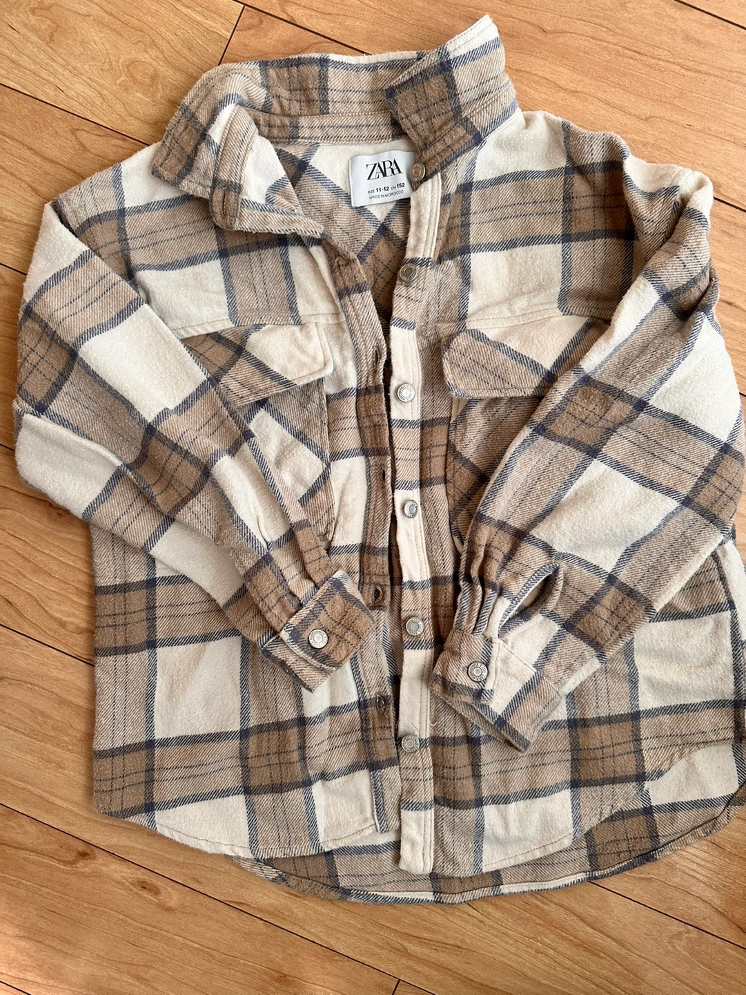 Brown and white plaid flannel shirt with button down closure and two front pockets. The shirt is long sleeved and has a curved hem. The tag says size 11-12 (152). Made in Morocco.
