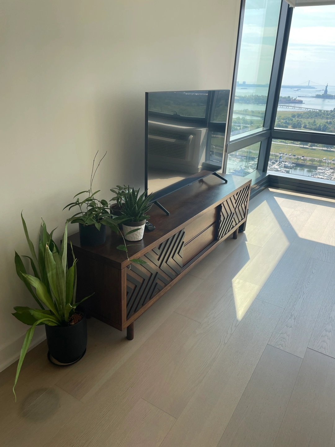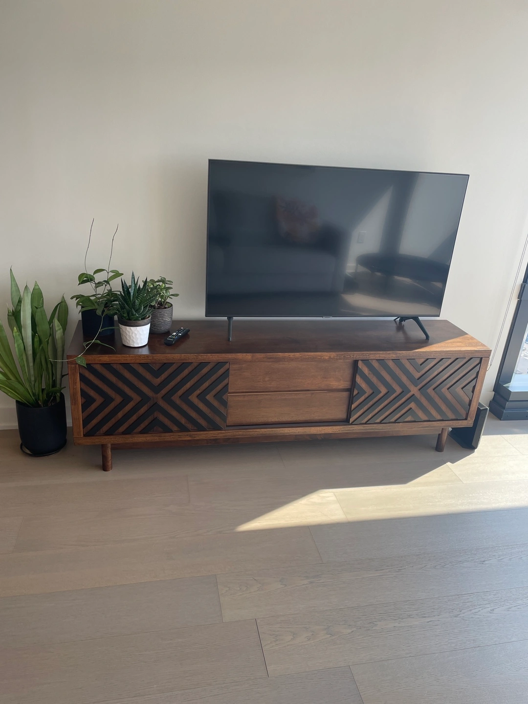 Wood TV stand with geometric design. Two drawers and 4 shelves