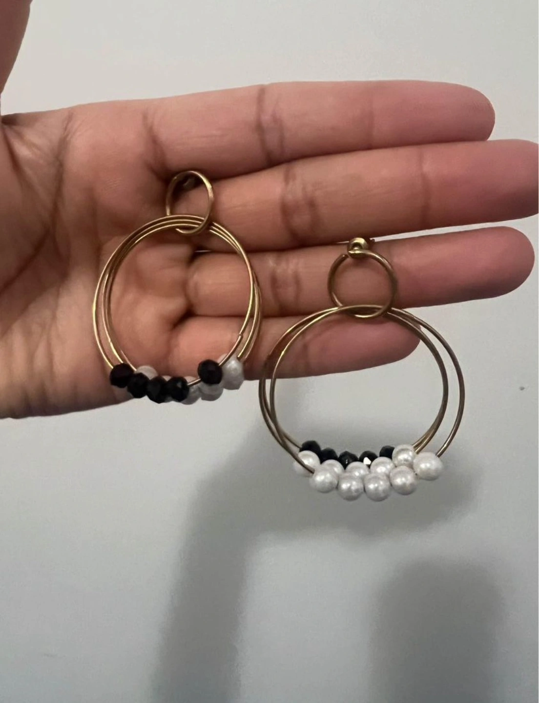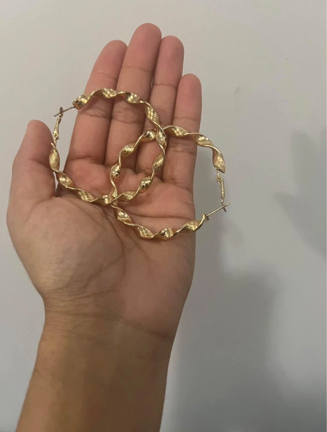 These are two pairs of gold hoop earrings. One pair has a beaded design, the other pair is a twisted design.