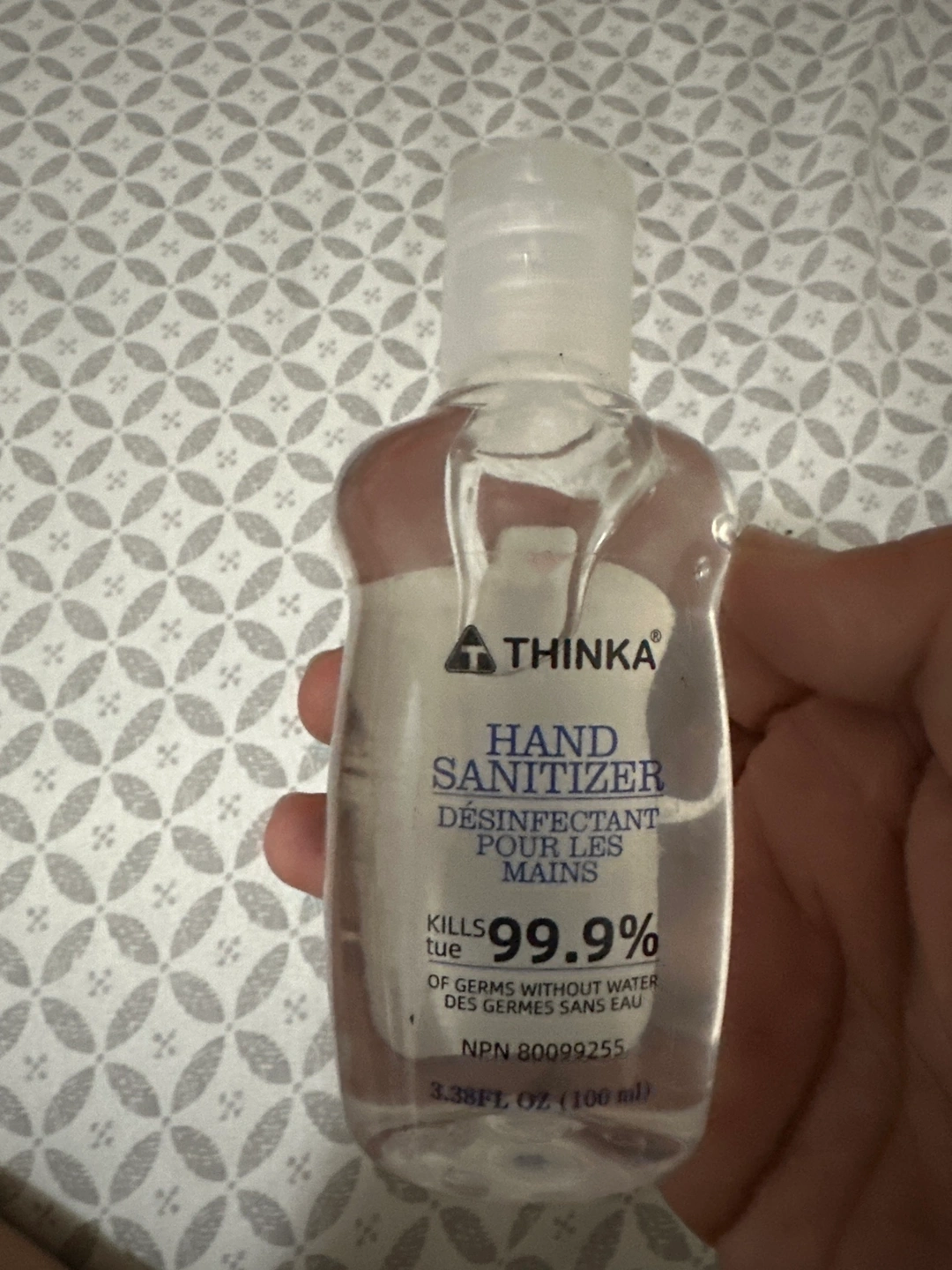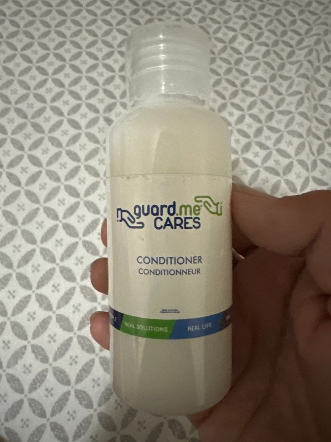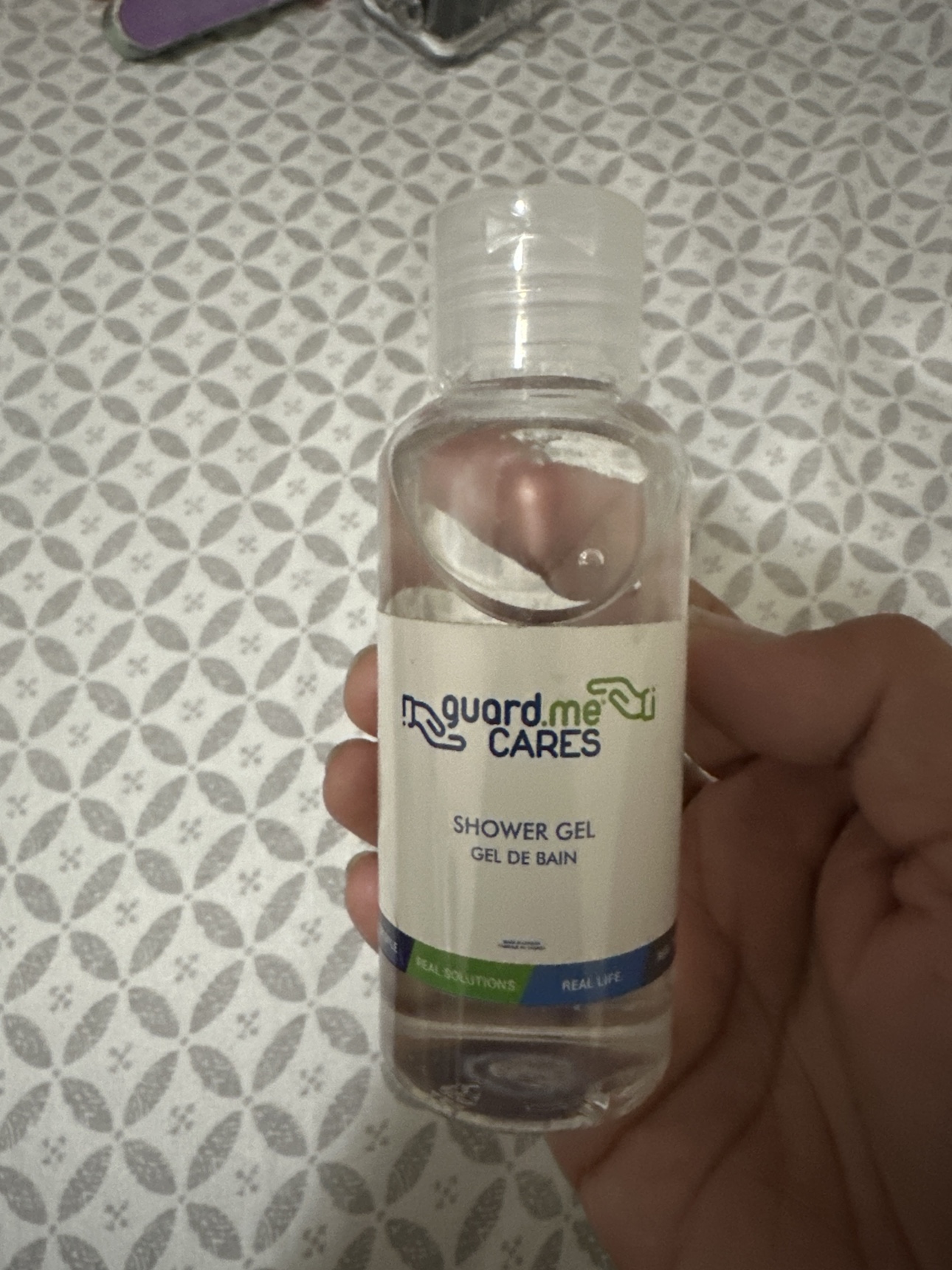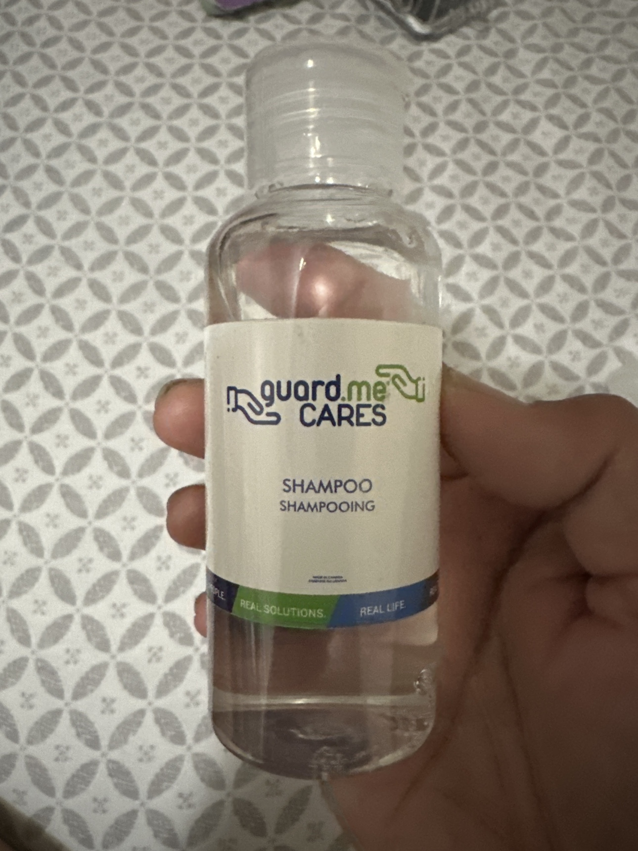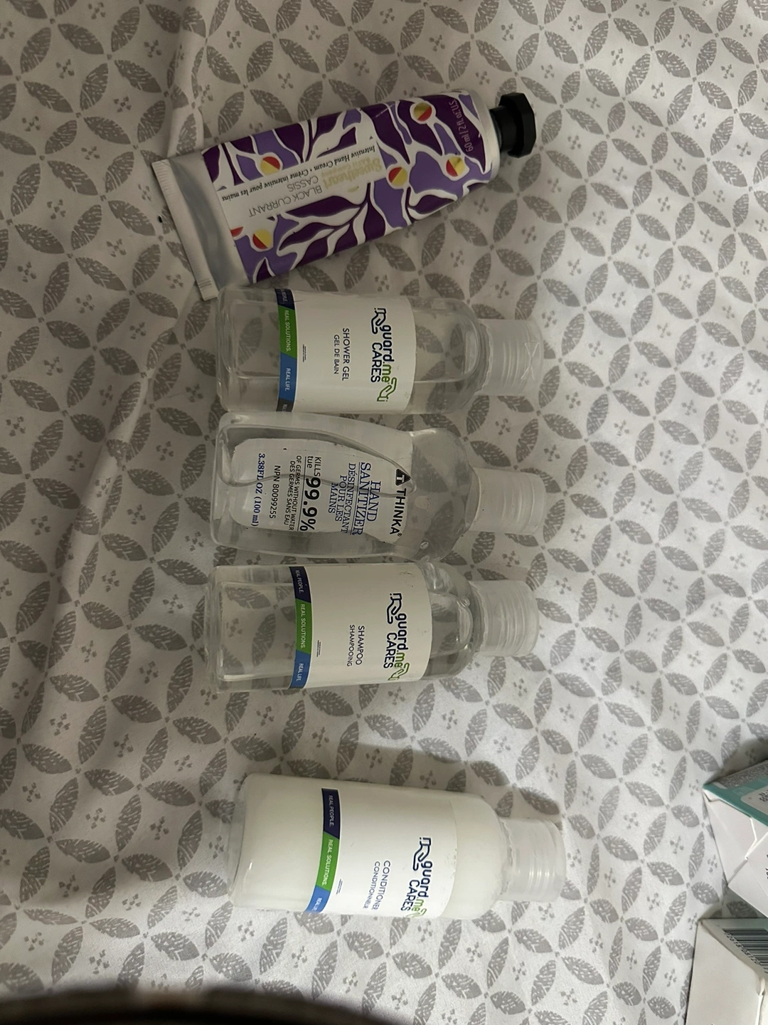 Set of 5 travel-sized toiletries. Includes Thinka hand sanitizer and four Guard.me Cares products: shower gel, shampoo, conditioner, and hand sanitizer.