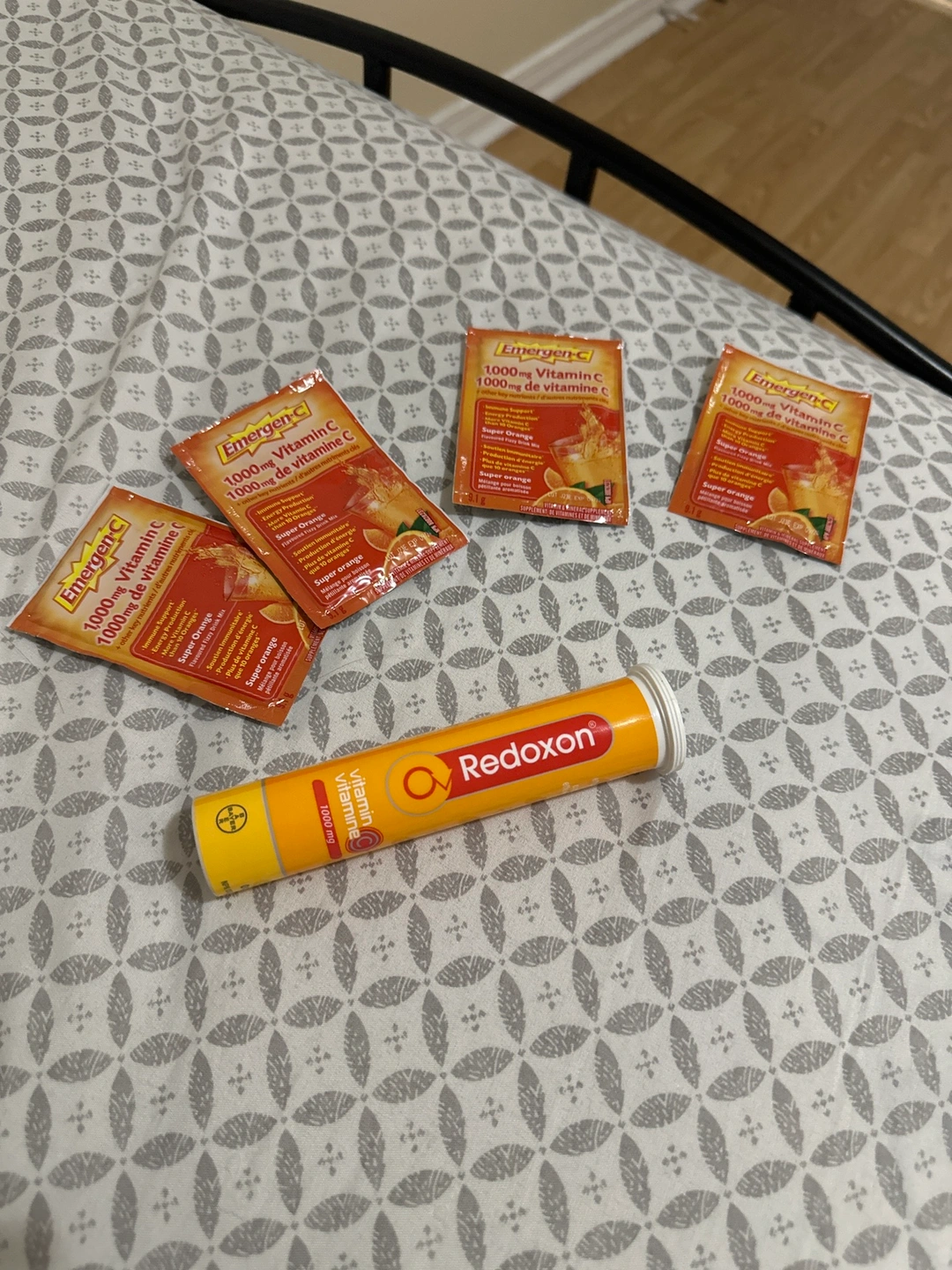 Five packets of Emergen-C Vitamin C powder in Super Orange flavour. Also included is one tube of Redoxon Vitamin C tablets.