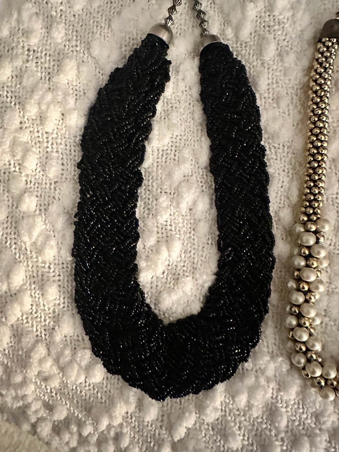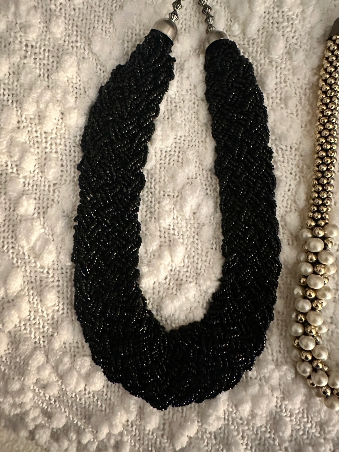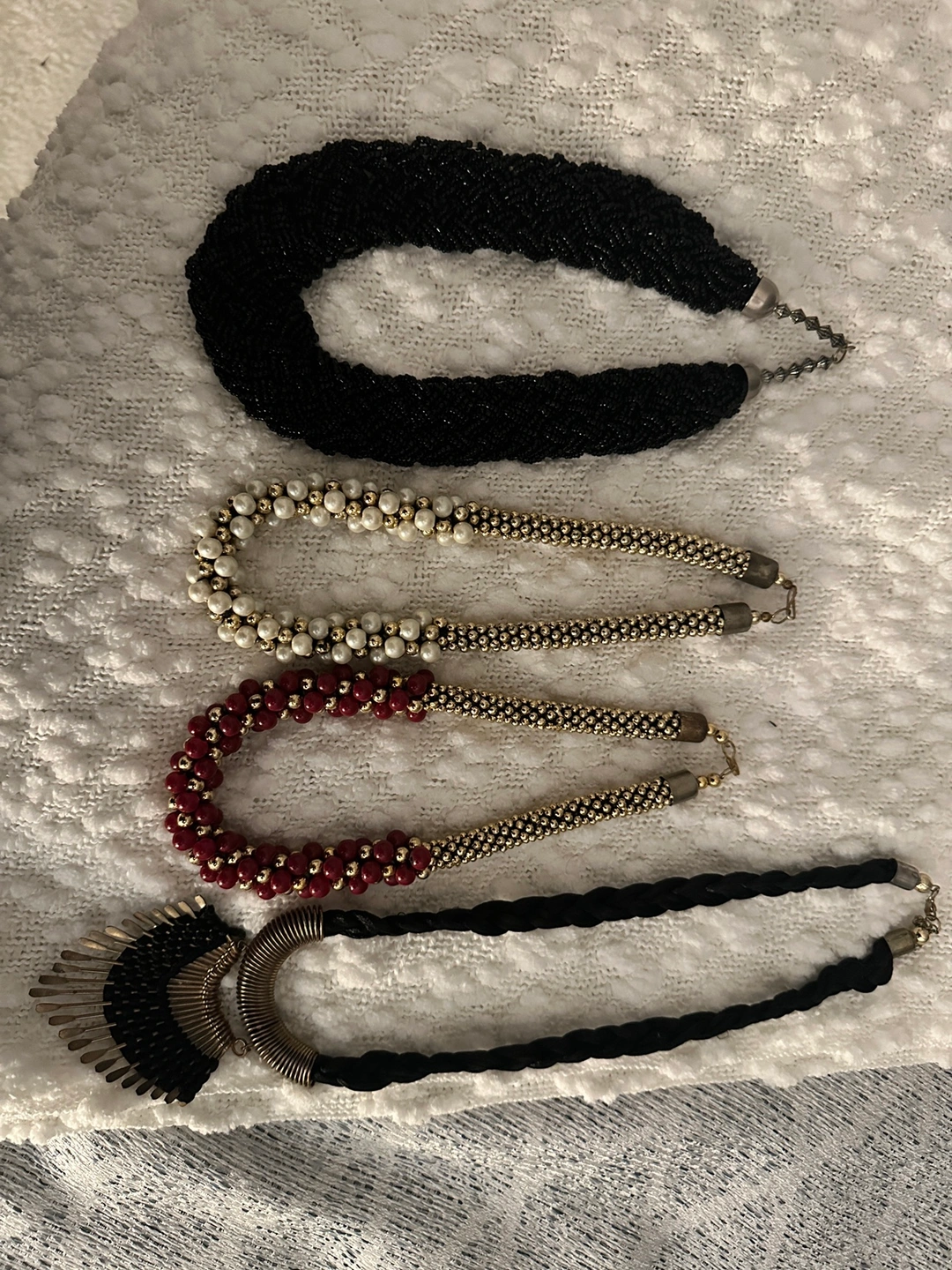 Necklaces- beaded necklaces, black, silver, gold/white, and red/gold. All are approximately 18 inches in length.