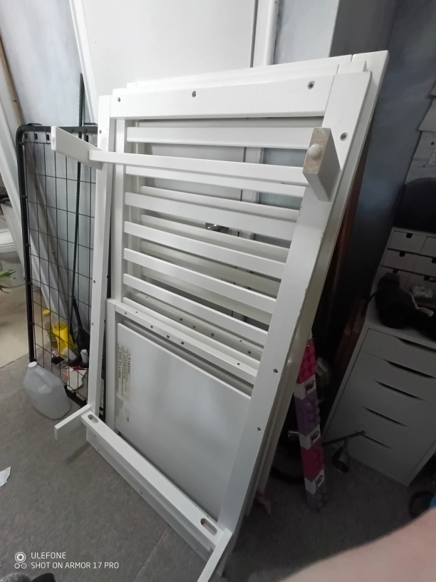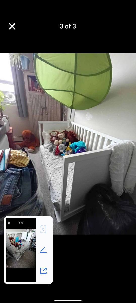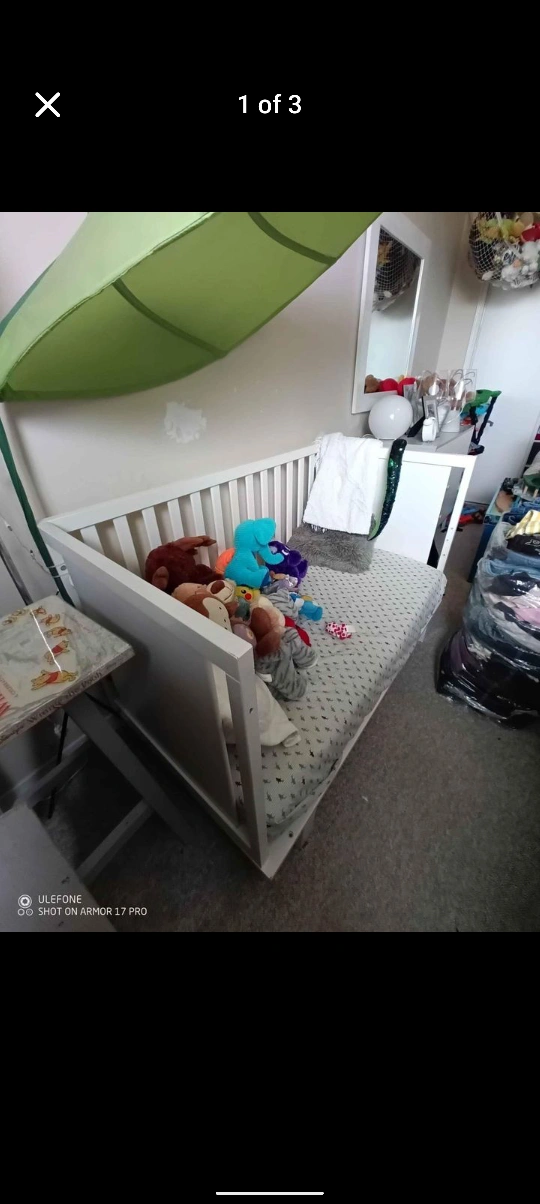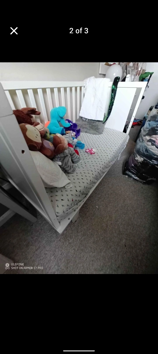 All in one crib, so 4 stages. The last stage for a single bed you purchase the standard converter. This crib was never used for sleeping, it was converted to a day bed as a reading cubby and only the stuffed animals used it. It is now disassembled and ready to go. All pieces, all hardware and tools are together.