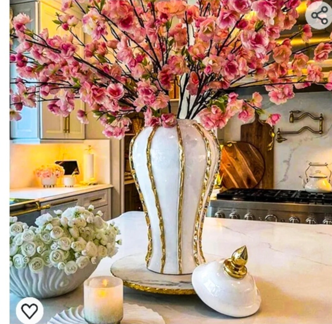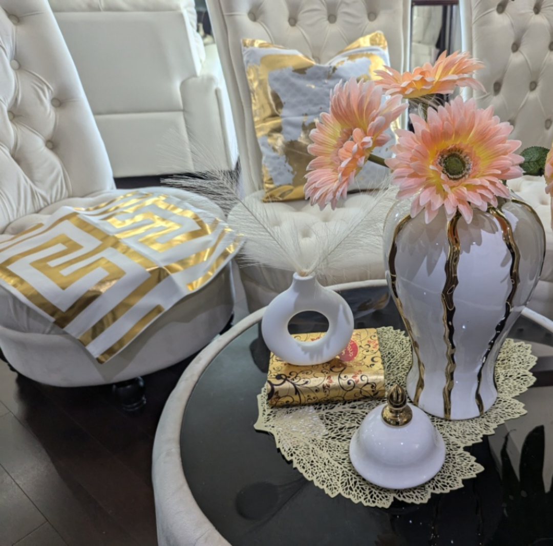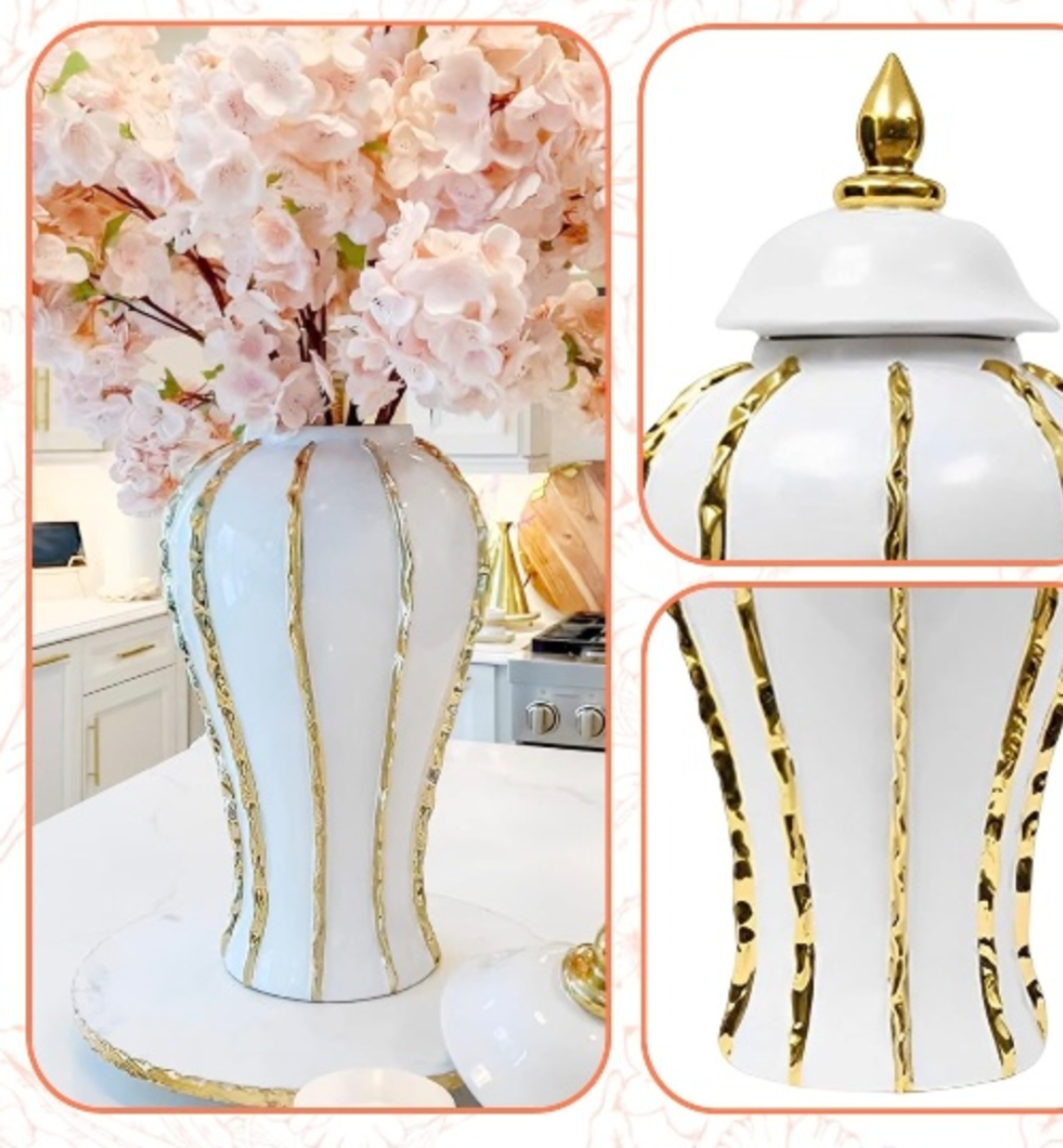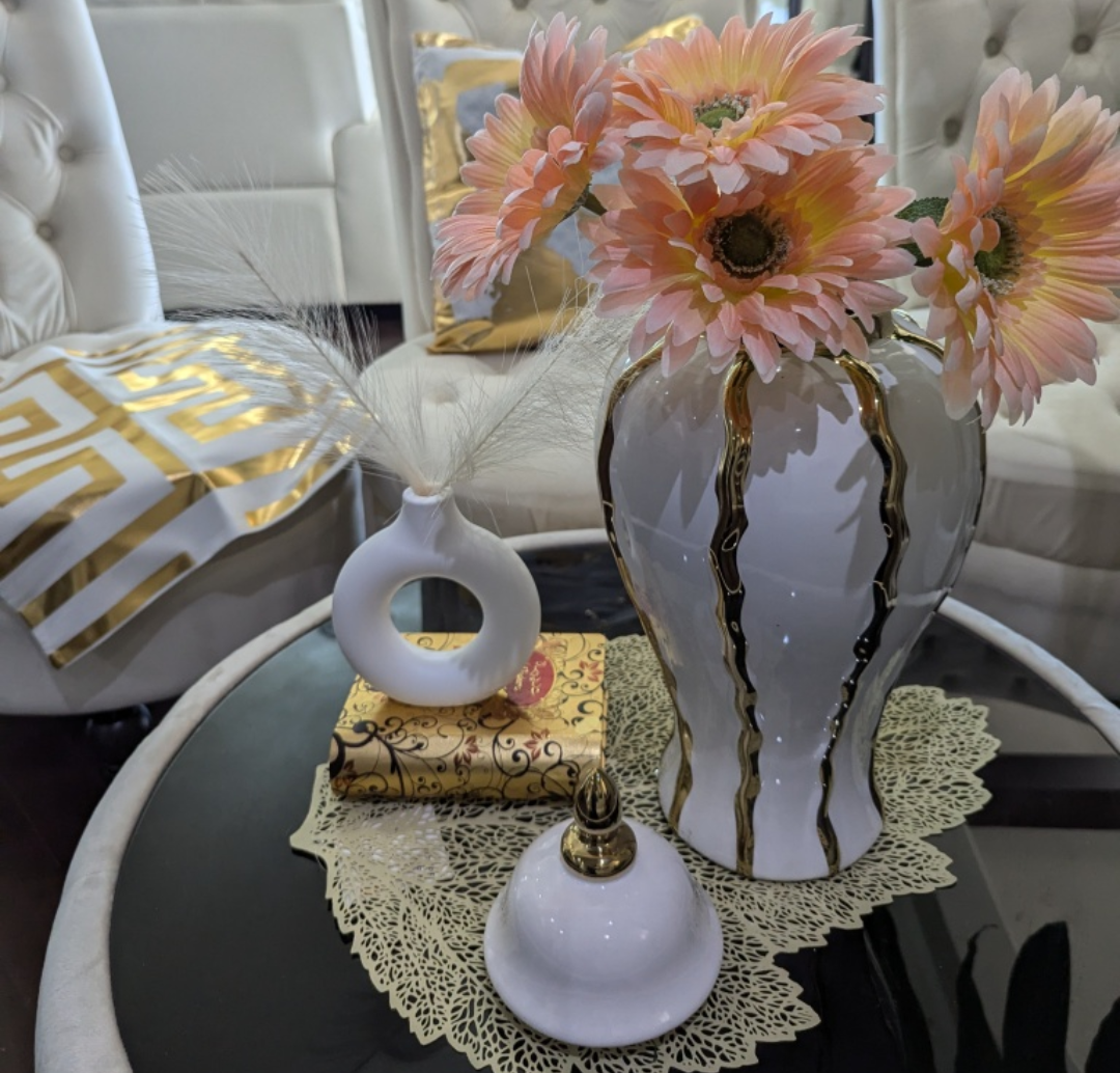 Elegant and stylish white vase with gold accents. Perfect for a modern or contemporary home. Comes with a lid.you can buy other stuff in picture 3 and 4 like white and gold cushion covers donut vase etc