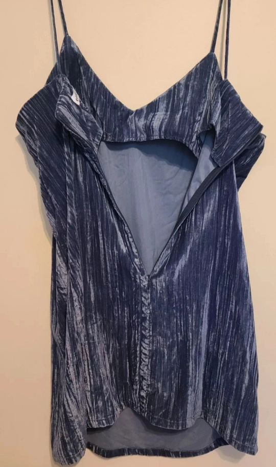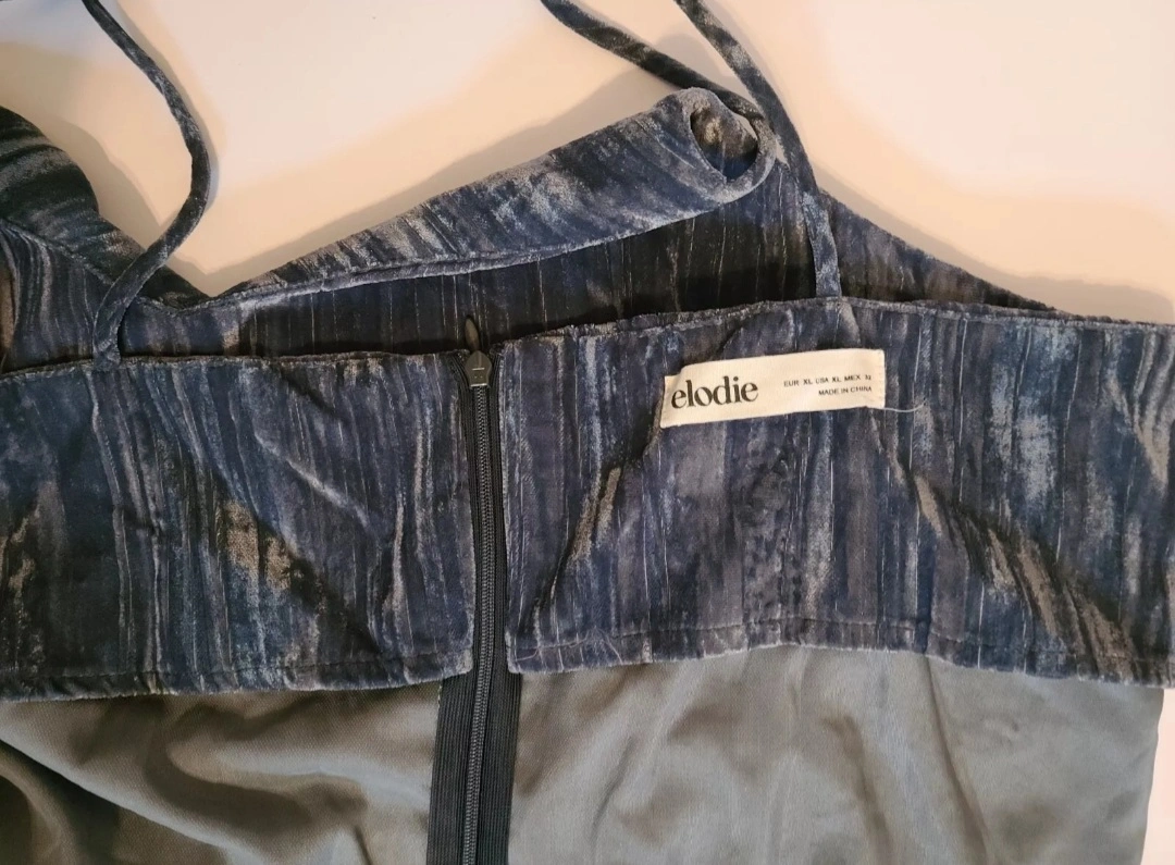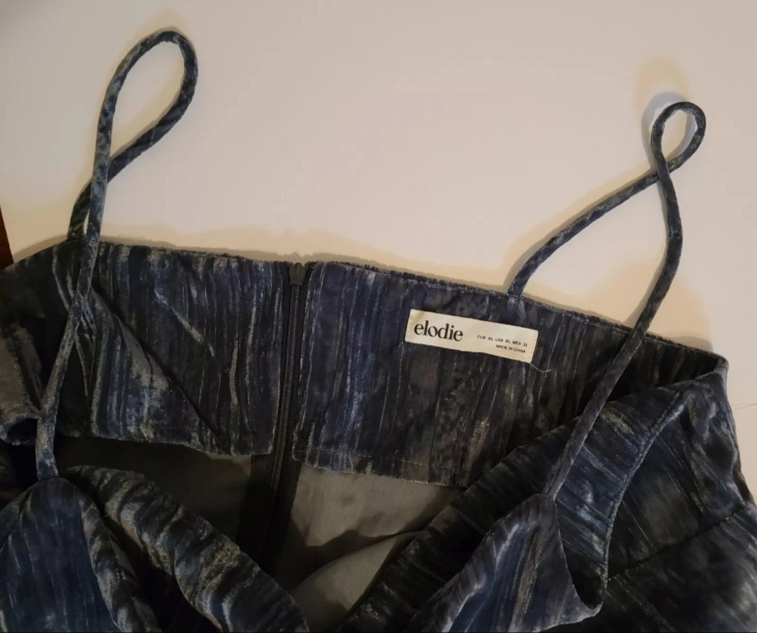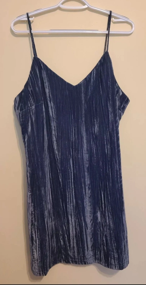 This Elodie dress in size XL is a stunning addition to any wardrobe. The crushed velvet fabric in a beautiful blueish grey color makes it perfect for any occasion, from a party to a casual outing. The sweetheart neckline and sleeveless design are accentuated with delicate spaghetti straps, adding a touch of elegance to the sheath style dress. The dress is easy to wear with its zip closure. The dress length is short, making it perfect for summer or spring or any sexy date night!