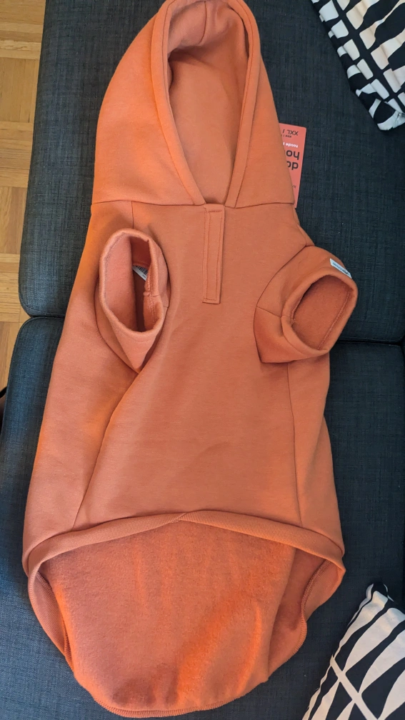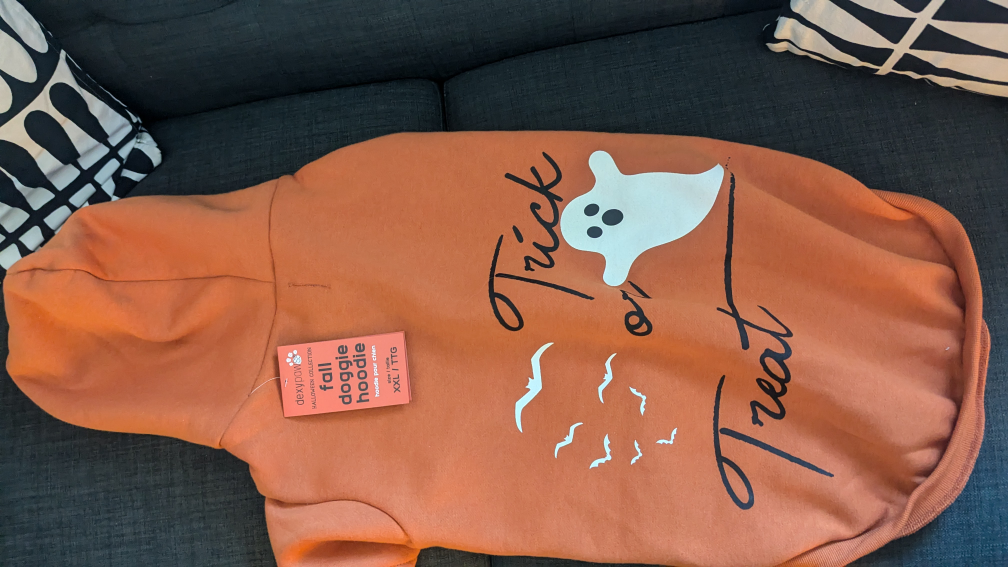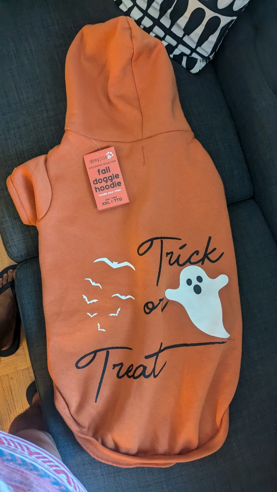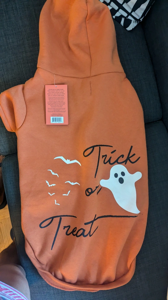A cute orange hoodie with a ghost and bats on the back. It says "Trick or Treat" on the back. It is size XXL. My 75lbs dog doesn't like it Lol, not used, still has a price tag Retail 24.99