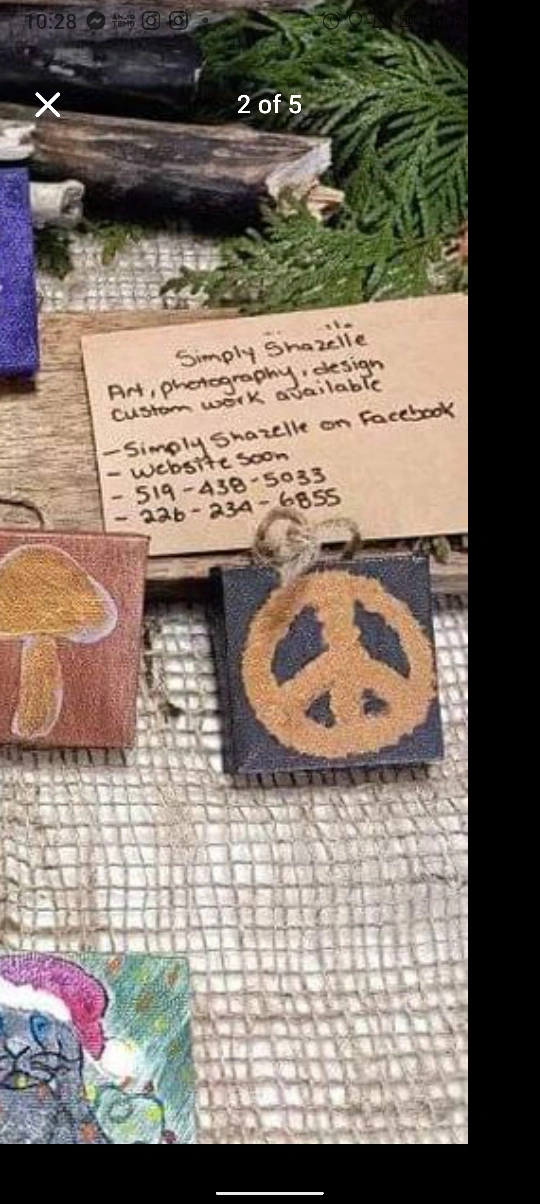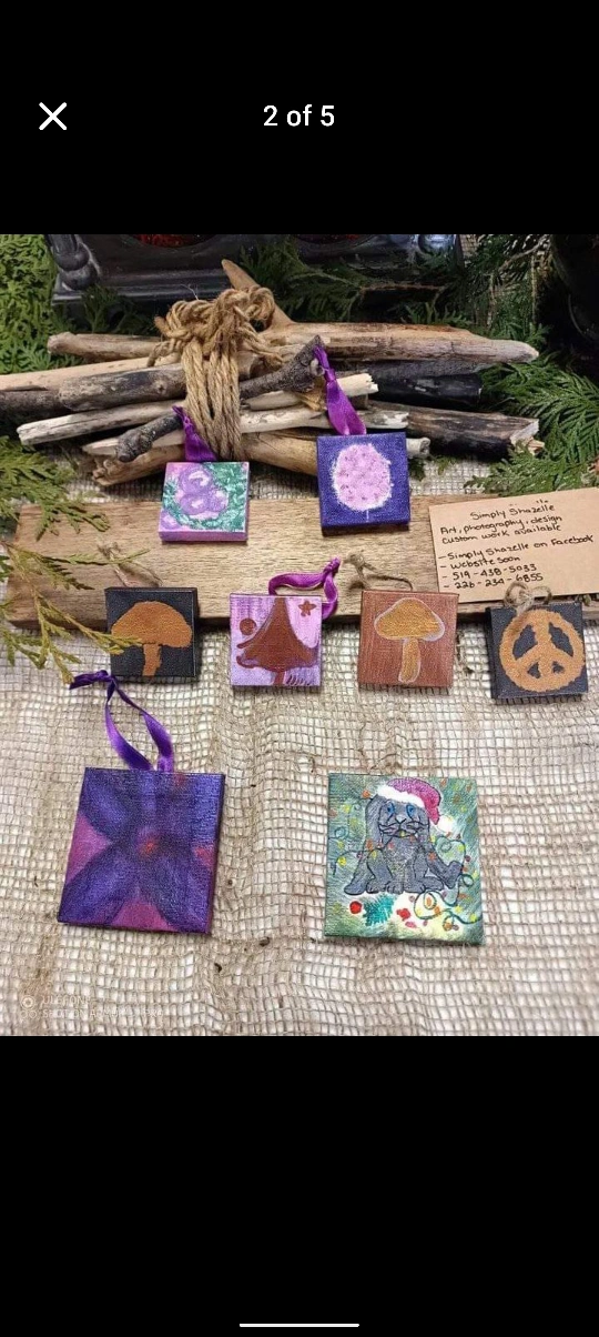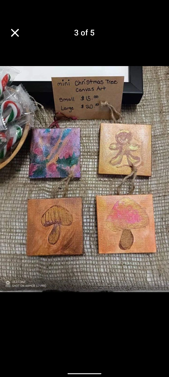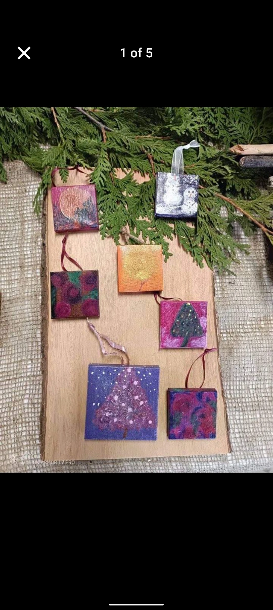 These are mini Christmas Tree Ornaments, painted on canvases. They are all unique and beautiful. Custom orders available.