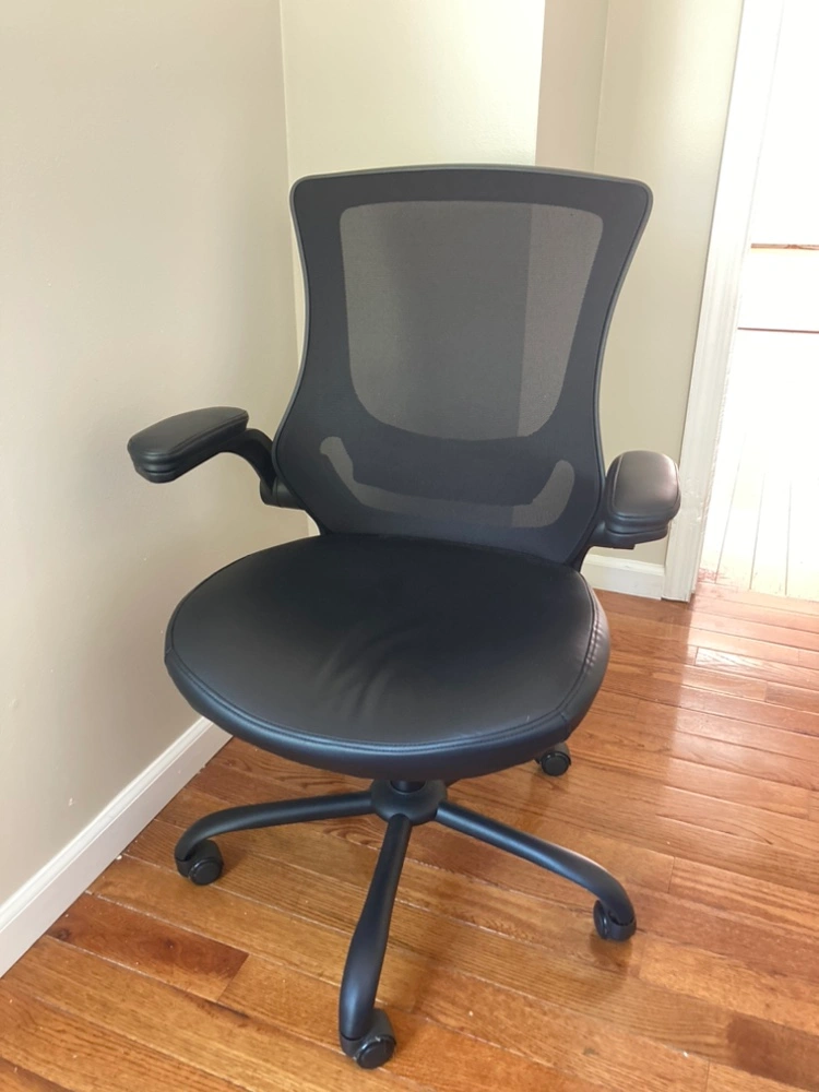 Black office chair with mesh back and black leather seat. Adjustable arms, height, back support and has wheels.