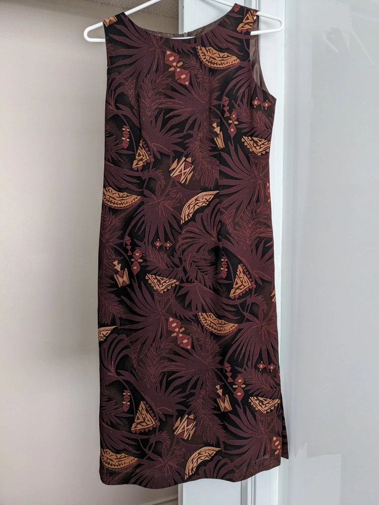 A sleeveless dress with a brown, black, and tan tropical print. The dress is midi-length. Xs-S with a zipper