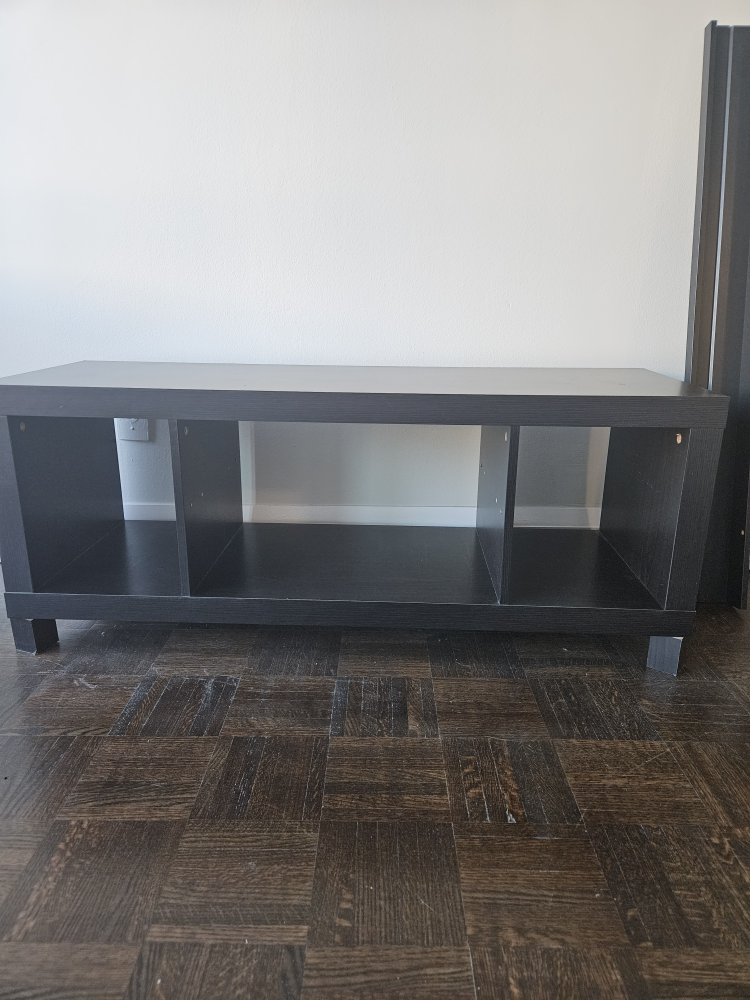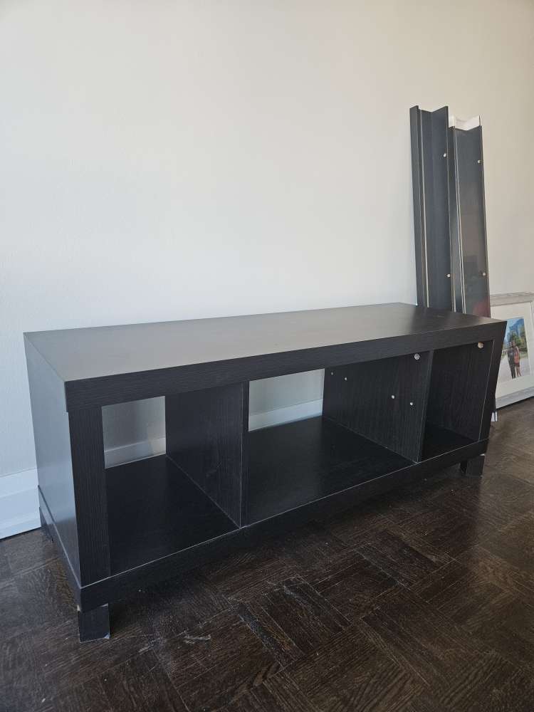 Black TV stand with storage shelves, disassembled and ready for pickup. Comes with all parts.