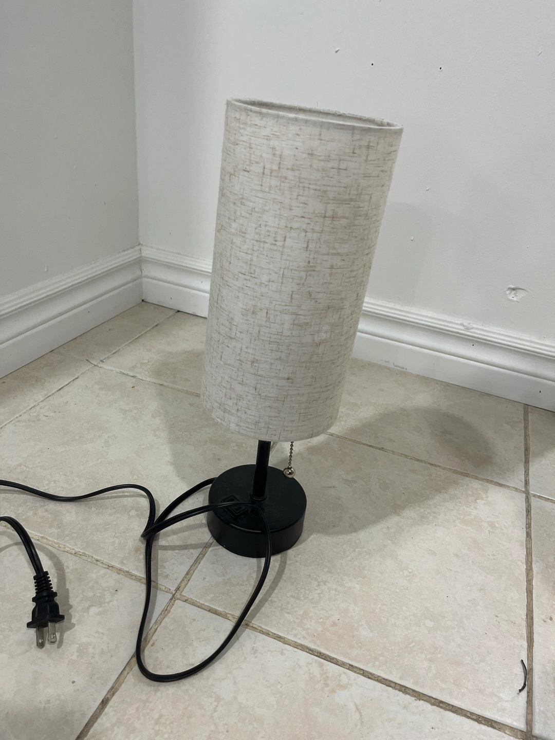 A small table lamp with a beige fabric lampshade. It has a pull chain for turning the light on and off. The lamp has a black base and cord. The cord has a standard Canadian three prong plug.
