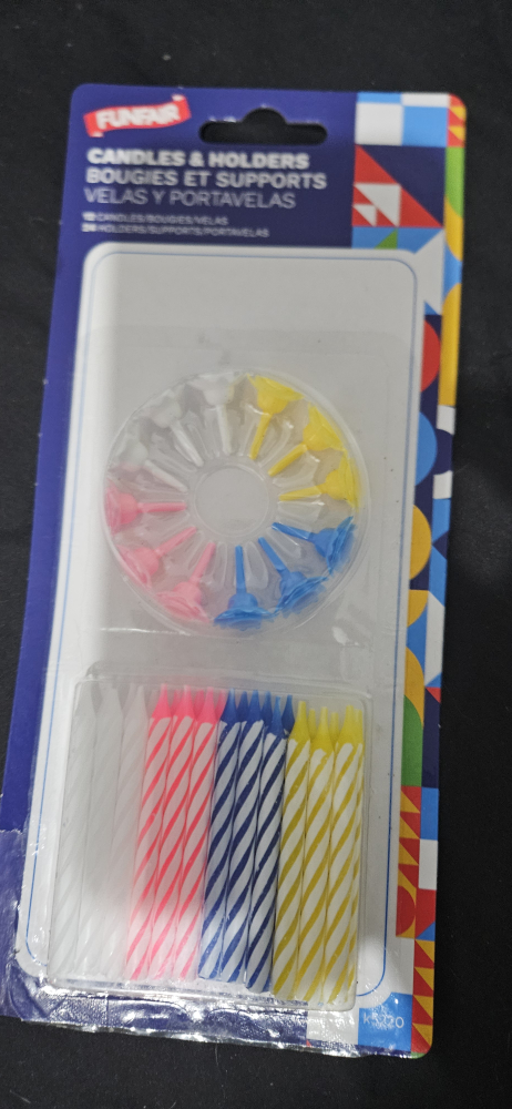 A package of birthday candles and holders, there are 12 candles and 12 holders. not my birthday anymore. giving to whoever birthday is coming up!