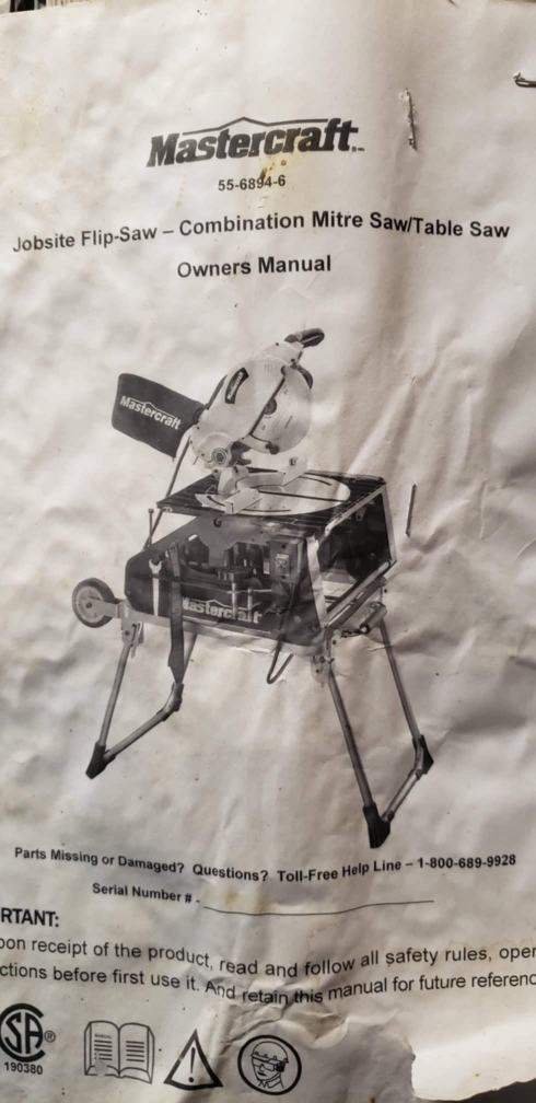 Mastercraft Jobsite Flip-Saw, Model # 55-6884-6. Includes owners manual. Comes with the stand and wheels. Used but in good condition. works fine hasn't been used for a while needs dusting
