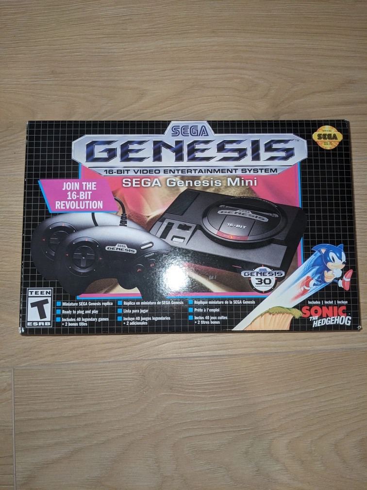 CIB. Includes 2 controllers. Comes with 40 classic Sega Genesis games. Features a classic console design, with a modern feel.