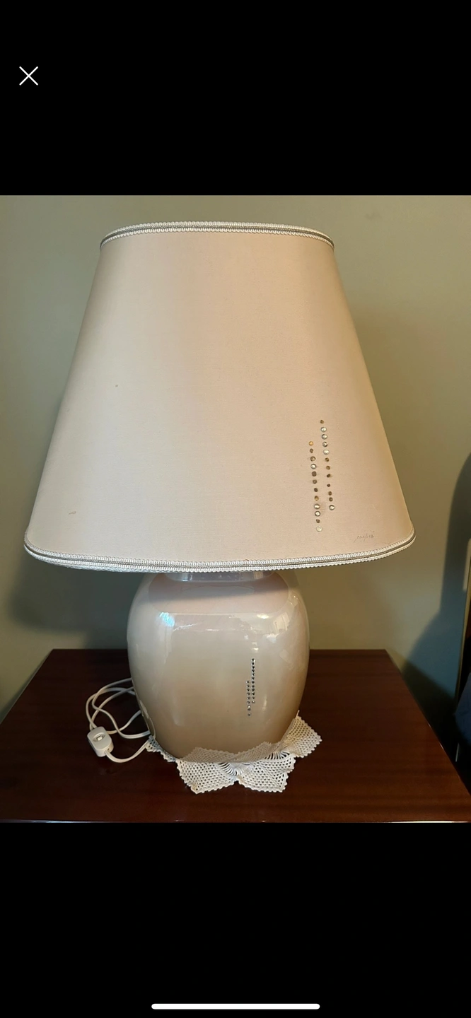 372Beige table lamps with a decorative shade. With crystal studs. The base and shade have a delicate, shimmery finish. The shade has a silver trim. The lamp has a built-in switch and comes with a cord. Originally from Italy. They are 25 inches tall. The lampshade is 18 inches wide. The base is 9 inches wide. Asking $27 for both or best offer. Cash only and pick up in Mississauga. All sales final and bundle offers are welcome.