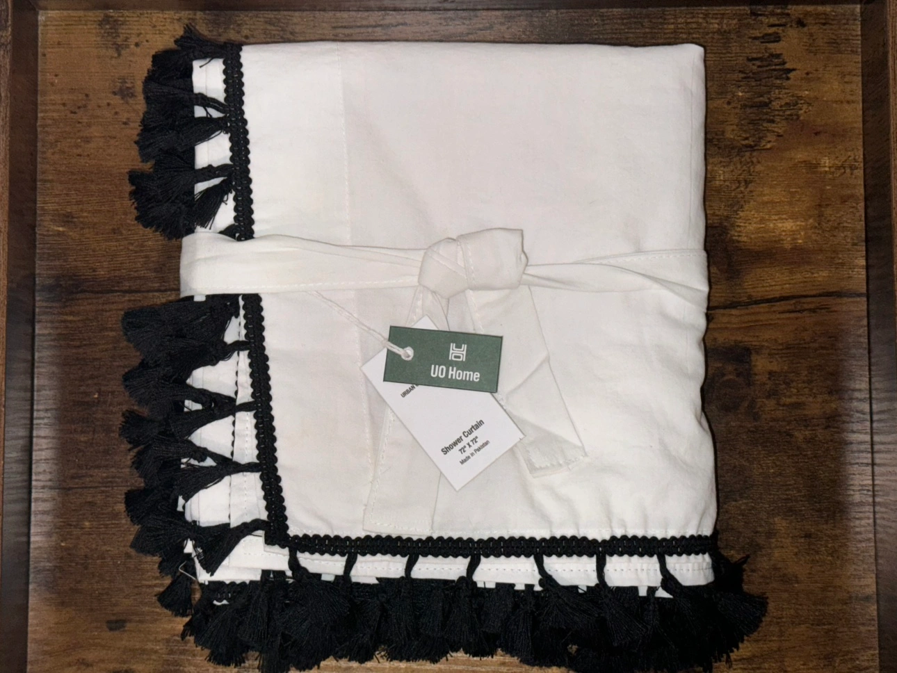 Add a chic and stylish touch to your bathroom with this Urban Outfitters Home shower curtain. It features a clean white base adorned with black tassels along the edges, adding just the right amount of character to any space. Made of durable, easy-care fabric, it’s a practical yet aesthetic choice.