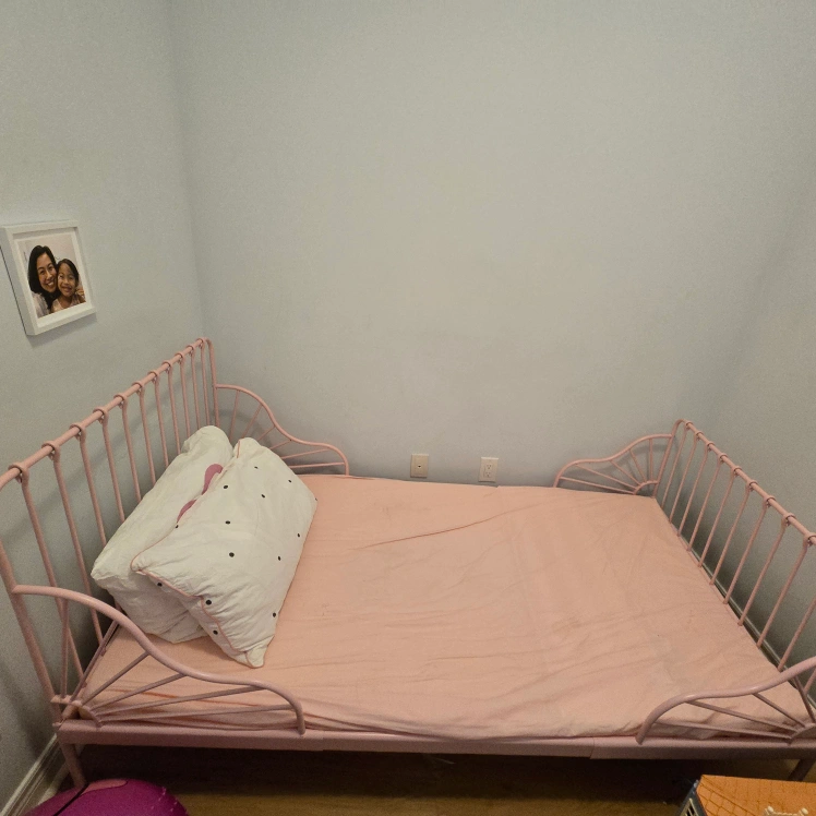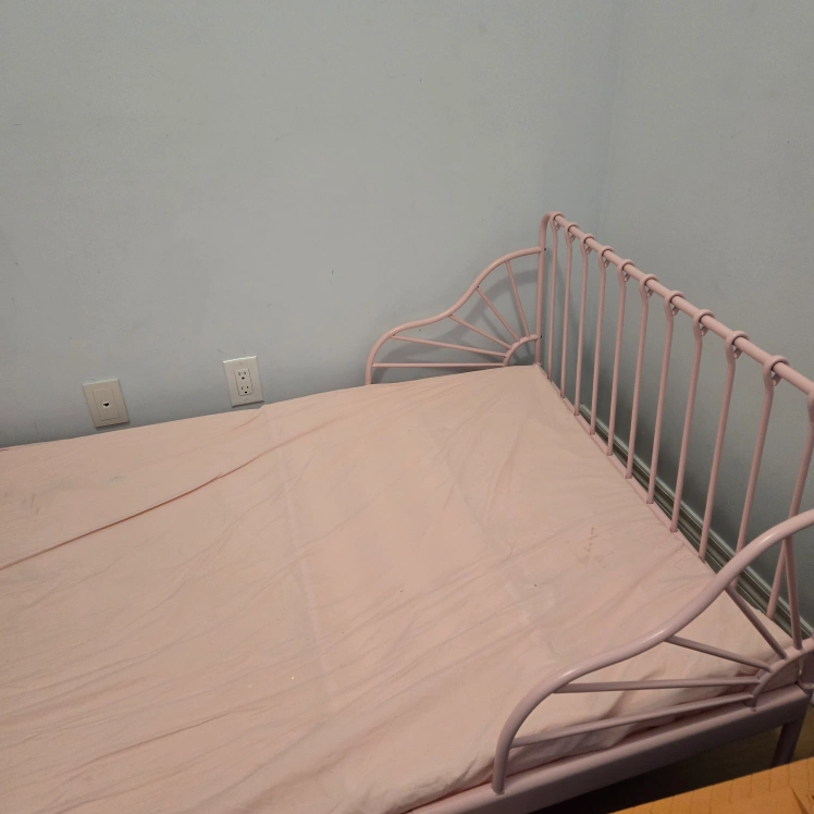 Used for less than 6 months. Includes the pink bed frame and wooden slats. Does not include the mattress and sheets. Metal frame can be adjusted berween a toddler bed and a single bed frame.