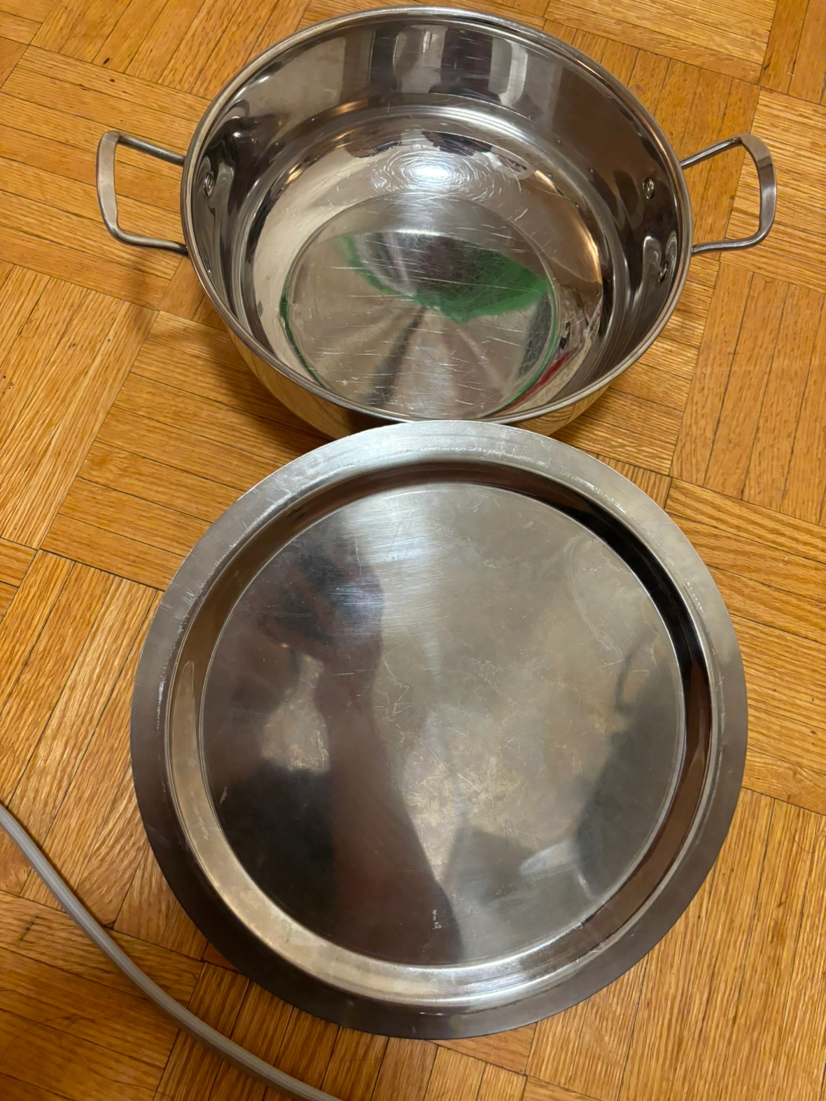Stainless steel pot with a lid, good for cooking and storing. The pot has two handles on each side and the lid has two handles on the sides. The pot is in good condition.