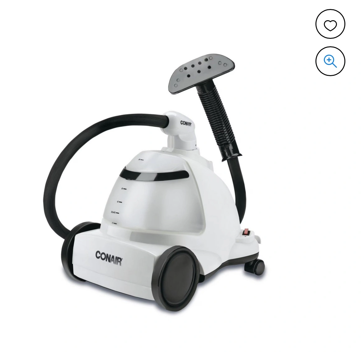 This is a Conair Garment Steamer that is great for removing wrinkles from clothing. It has a large water tank and a long hose. It's easy to use and can be moved around easily on its wheels. It comes with a variety of attachments for different types of clothing. It is in good working order.