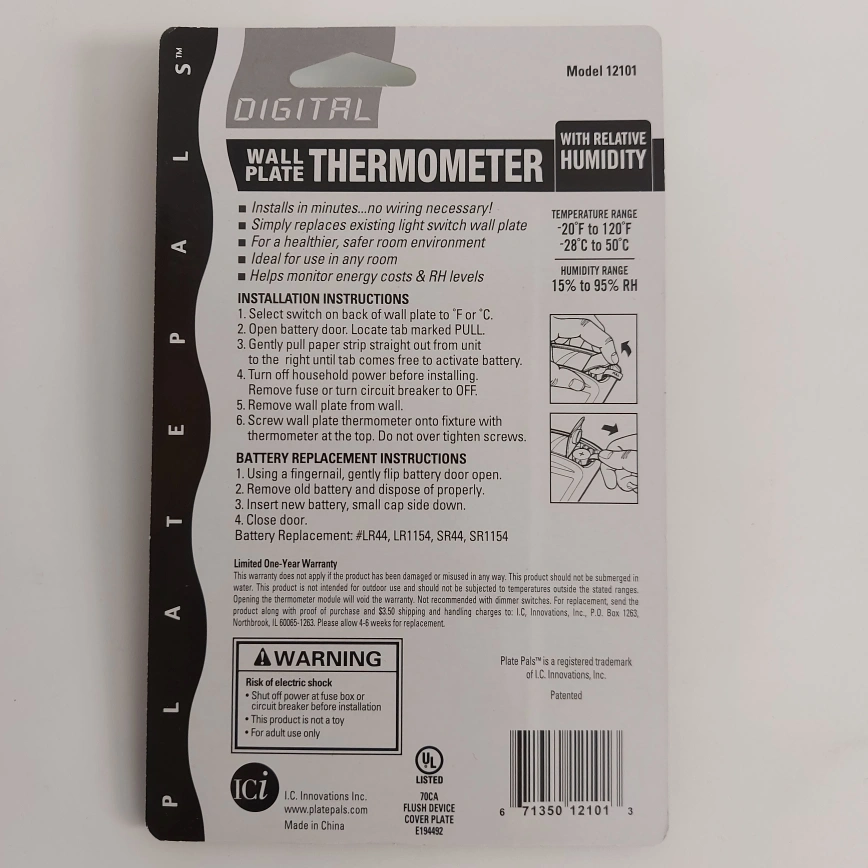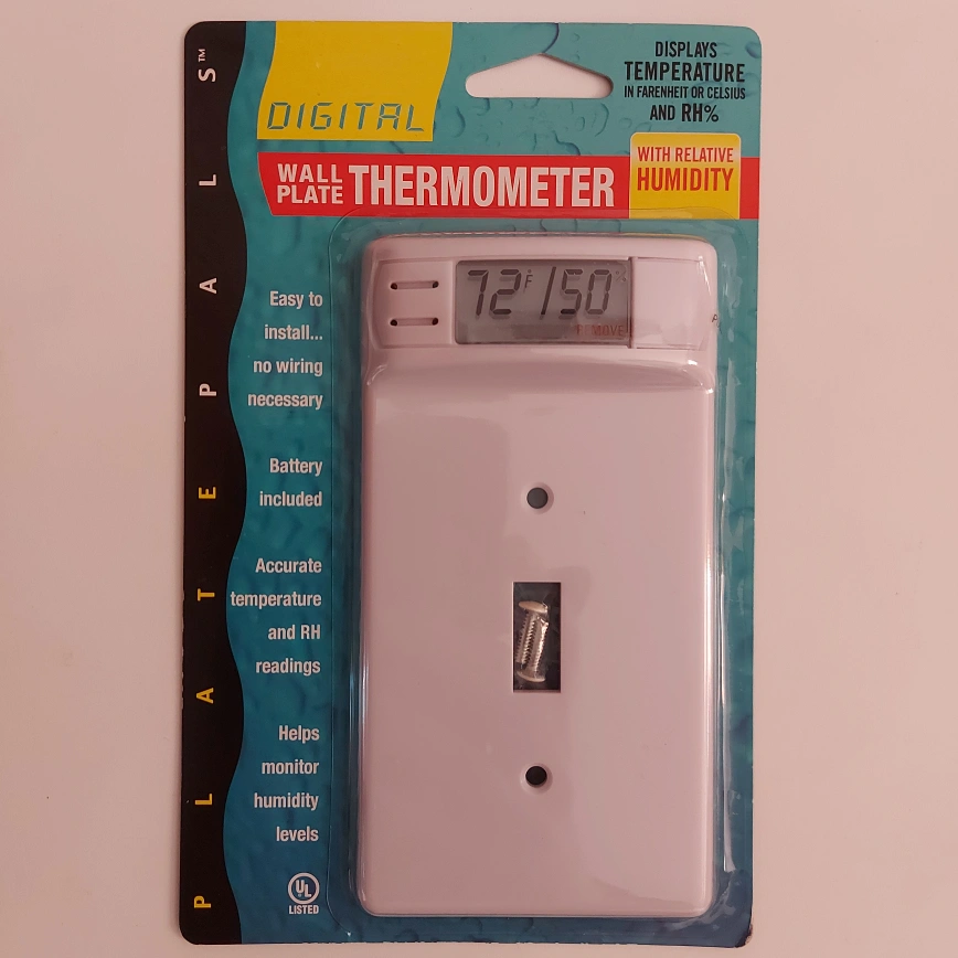 A pack of two digital wall plate thermometers that display temperature and humidity.