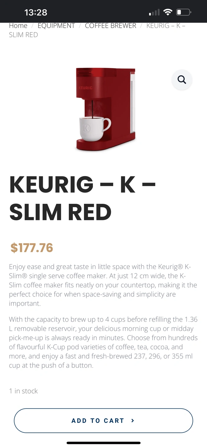 Red Keurig K-Slim coffee maker. It has a removable water reservoir. It can brew a cup of coffee, tea, cocoa, or hot chocolate. The Keurig K-Slim brewer is about 12 inches wide, making it perfect for small spaces.