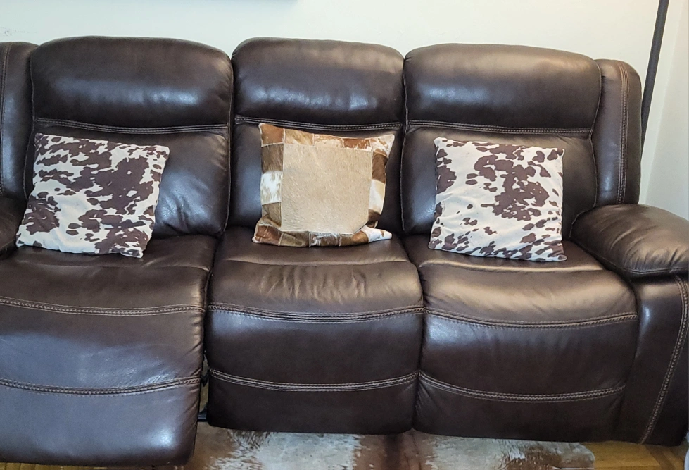 This is a brown leather recliner sofa. Price discounted from $650 to $250. It is a three-seater with a reclining function on the two end seats. The middle seat comes down and turns into tray with 2 cup holders. It comes with three throw pillows. This is a great deal!