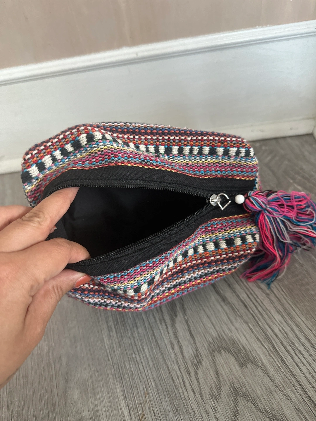 New zipped makeup/toiletry pouch with a black lining and tassel. The pouch is made of a beautiful woven fabric in a multi-coloured geometric pattern.