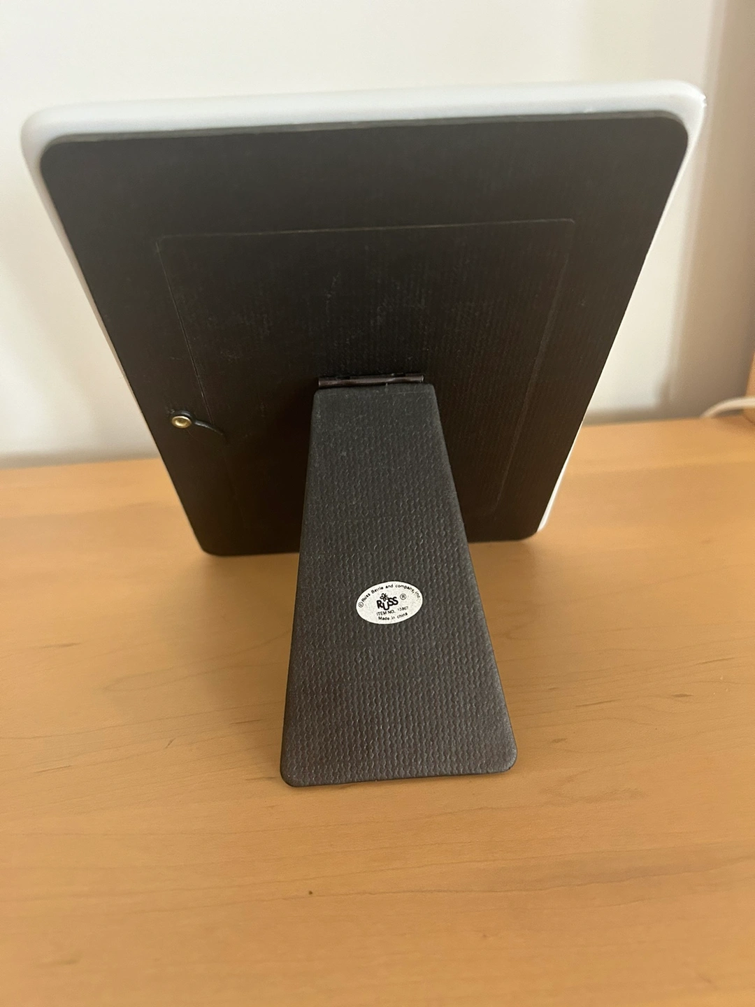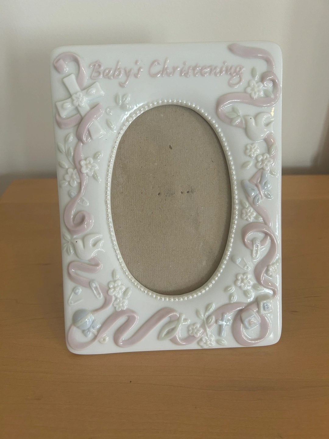 This is a beautiful picture frame for a baby's christening. It is made of porcelain and features a white background with pink accents and a small oval opening for a photo. It is in good condition.