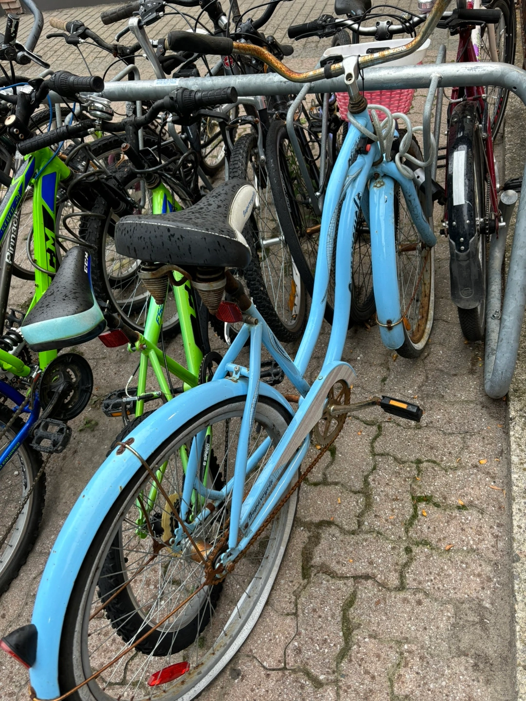 Light blue beach cruiser bicycle with a black saddle, black handlebars, and a silver chain. The bike has some rust on the frame. Fixed gear.