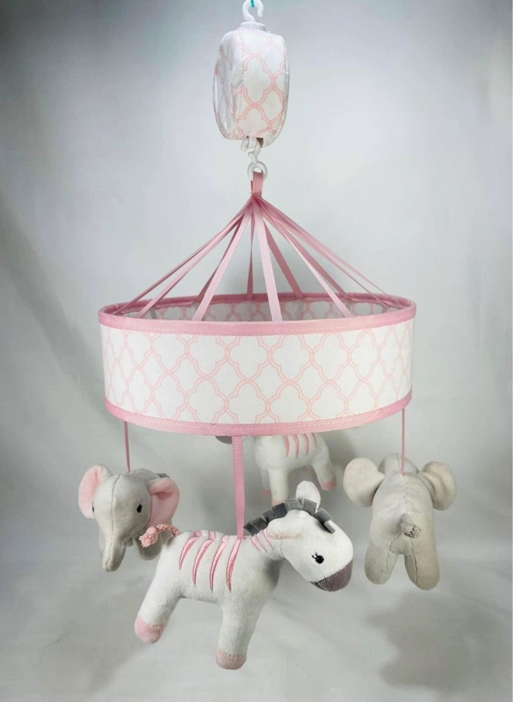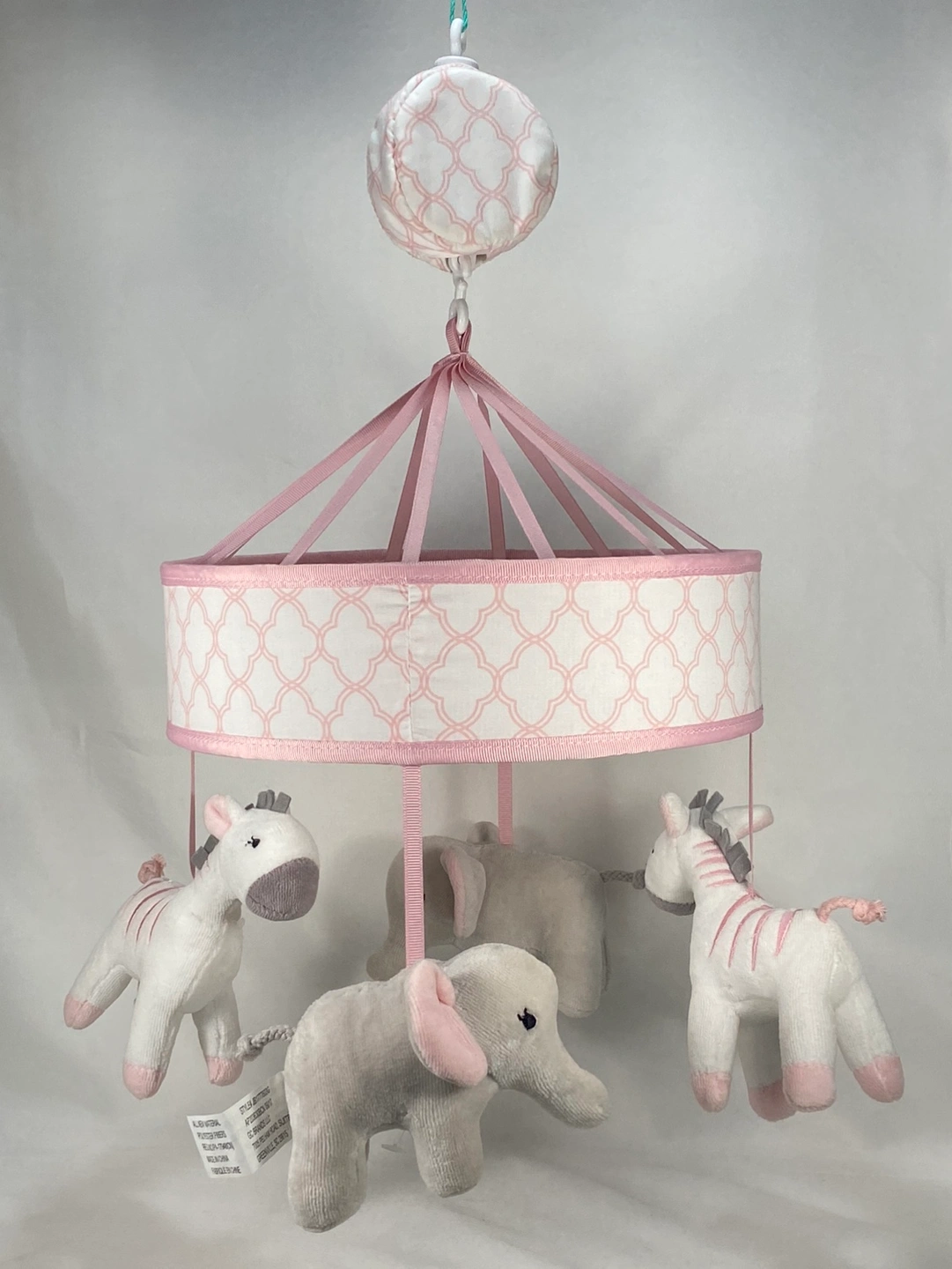 This baby crib mobile comes with a pink and grey fabric canopy, two grey elephants, and two zebras. The mobile plays a gentle melody when activated. (Note: Crib Mobile Arm NOT Included)