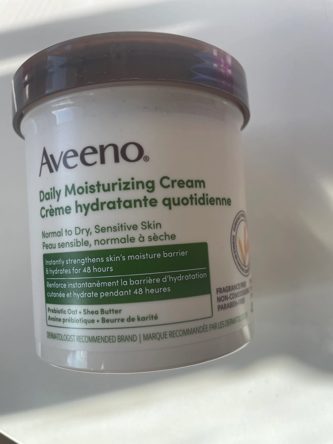 A tube of Aveeno Daily Moisturizing Cream for normal to dry, sensitive skin. It strengthens the skin's moisture barrier and hydrates for 48 hours. It also features prebiotic oat and shea butter. The product is fragrance-free, non-comedogenic, and paraben-free.