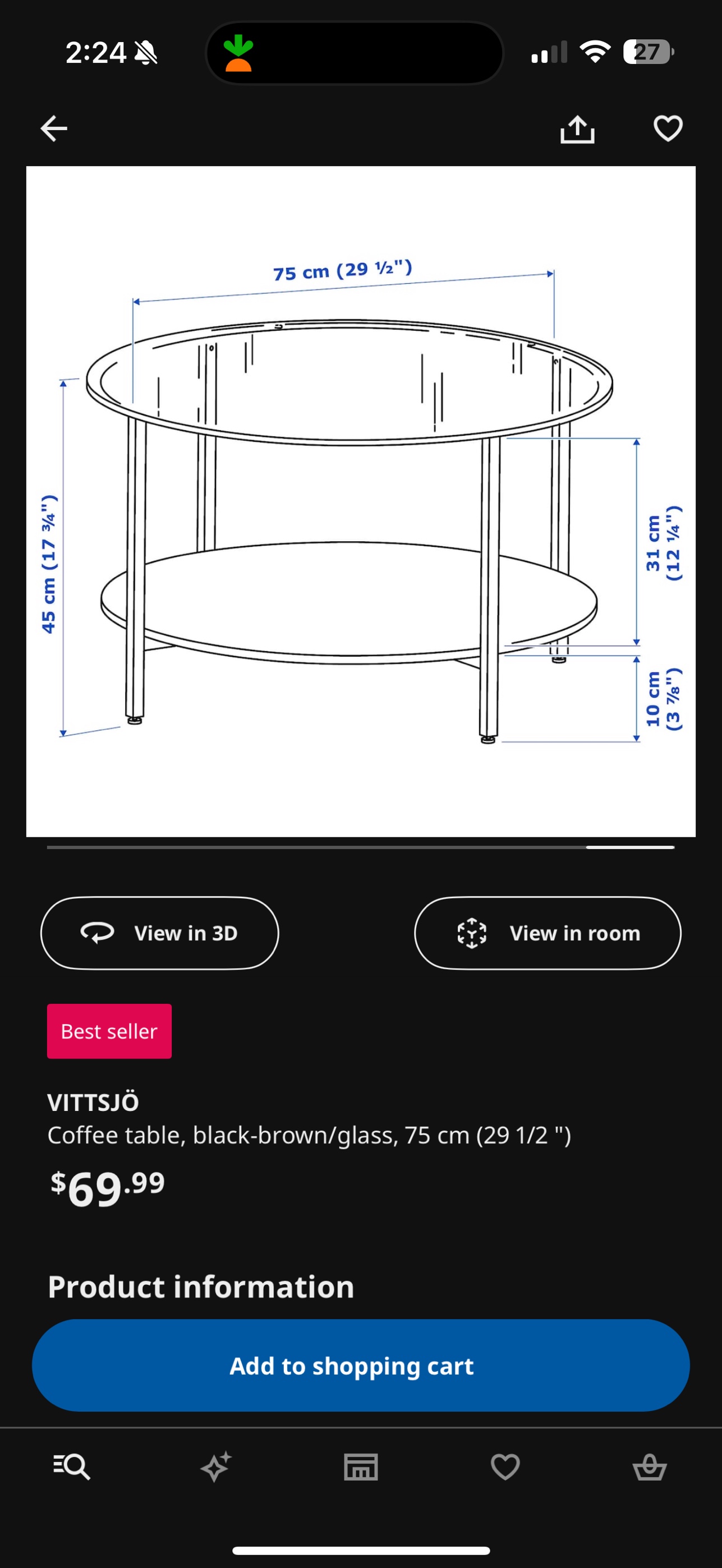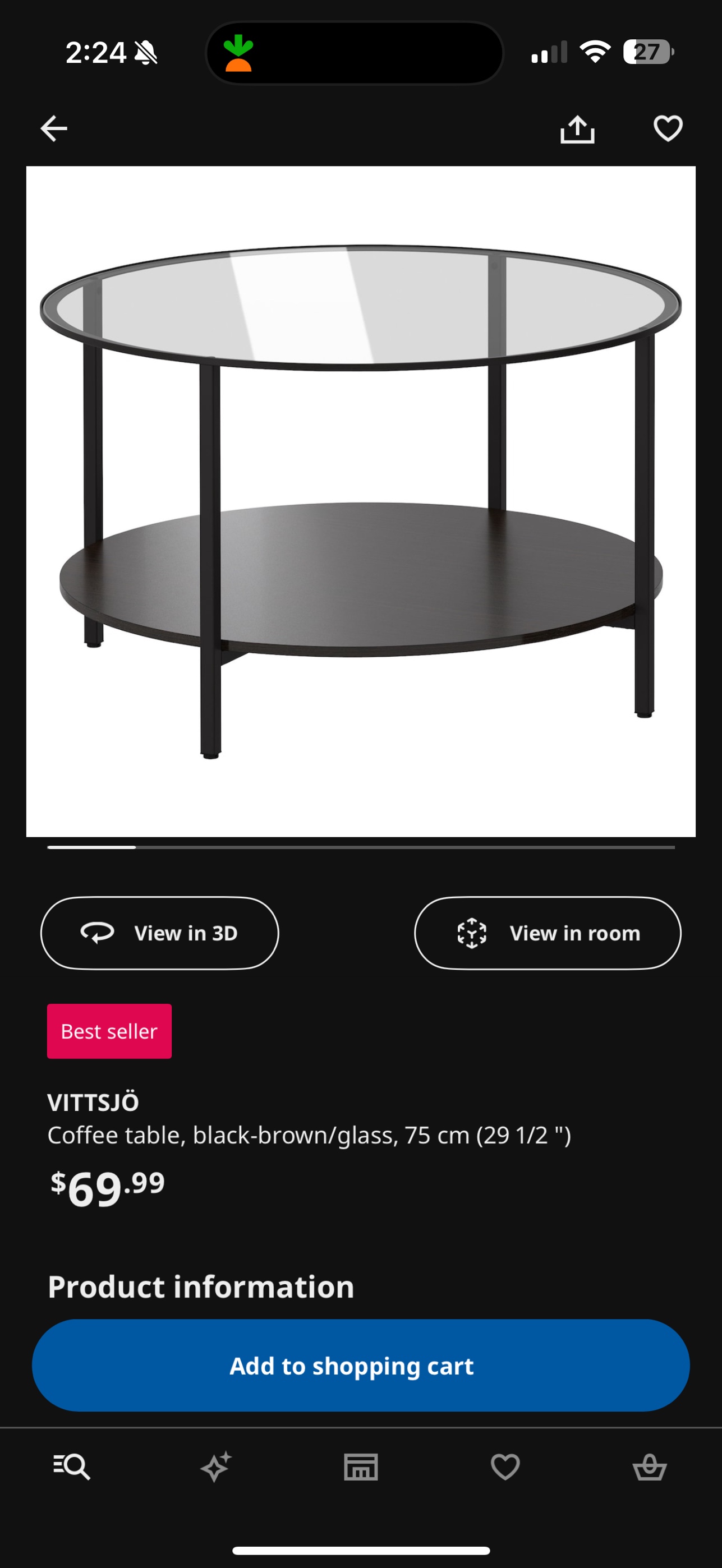 1 / 31 / 3Buy & SellIKEA VITTSJÖ Coffee TableIKEA VITTSJÖ Coffee Table$25Glass top coffee table with a black bottom shelfConditionGoodWHERE TO MEETLiberty VillageView MapSELLERNihaaLiberty Village7910 reviews1 chats·0 favorites·27 viewsSEND CHAT TO SELLERHi Nihaa! I’m interested in your listing.Hi Nihaa! I’m interested in your listing.Get the Karrot app to chatSign In to chat