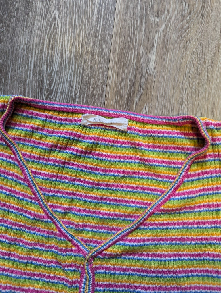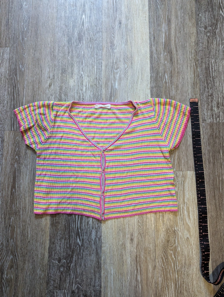 A colourful striped crop top with short sleeves. Snap buttons down the front