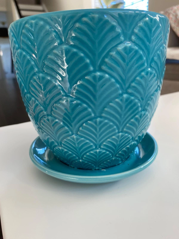Blue ceramic planter with saucer, features a leaf design.