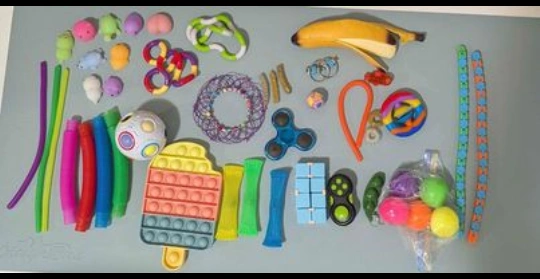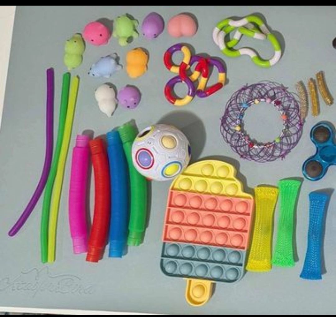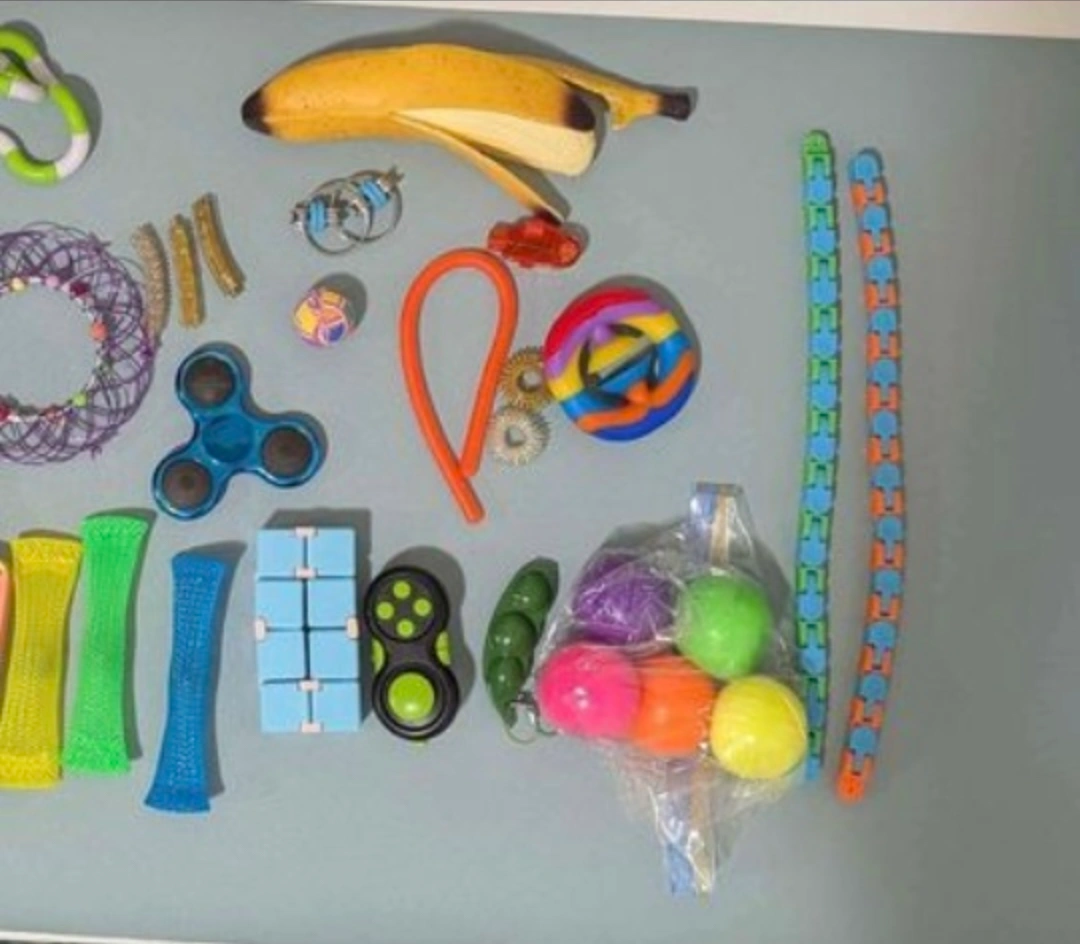 A variety of fidget toys (fidget spinner, infinity cube, pop it, fake banana, sensory fidget toys).