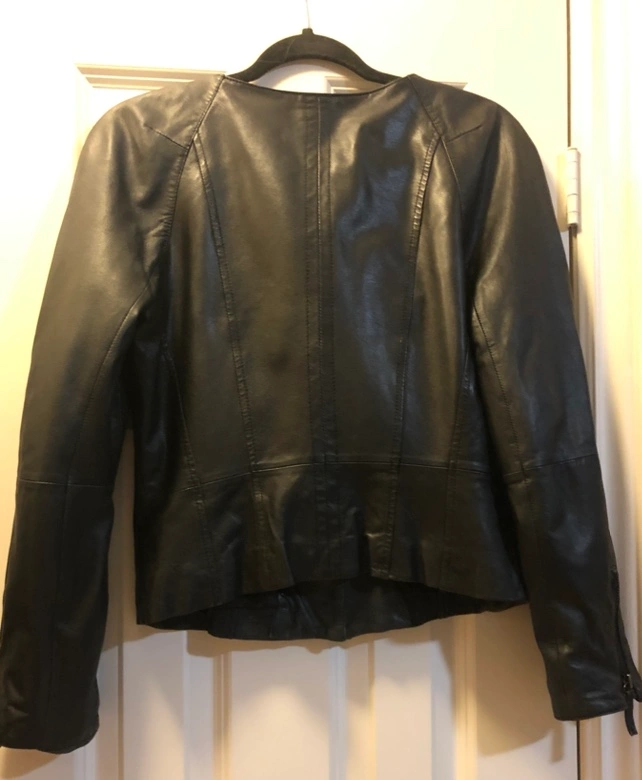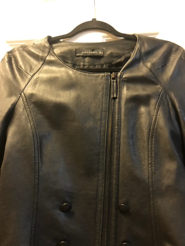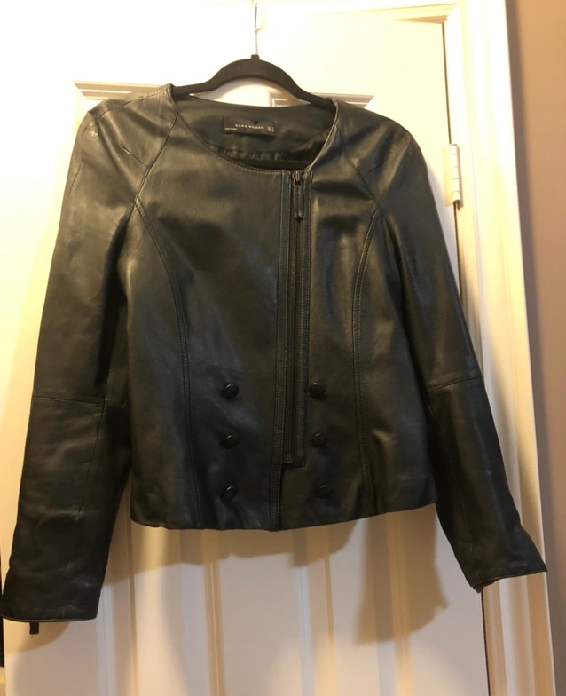 Black leather jacket with zipper closure, double breasted buttons, and zipper detailing on sleeves. Size Medium.