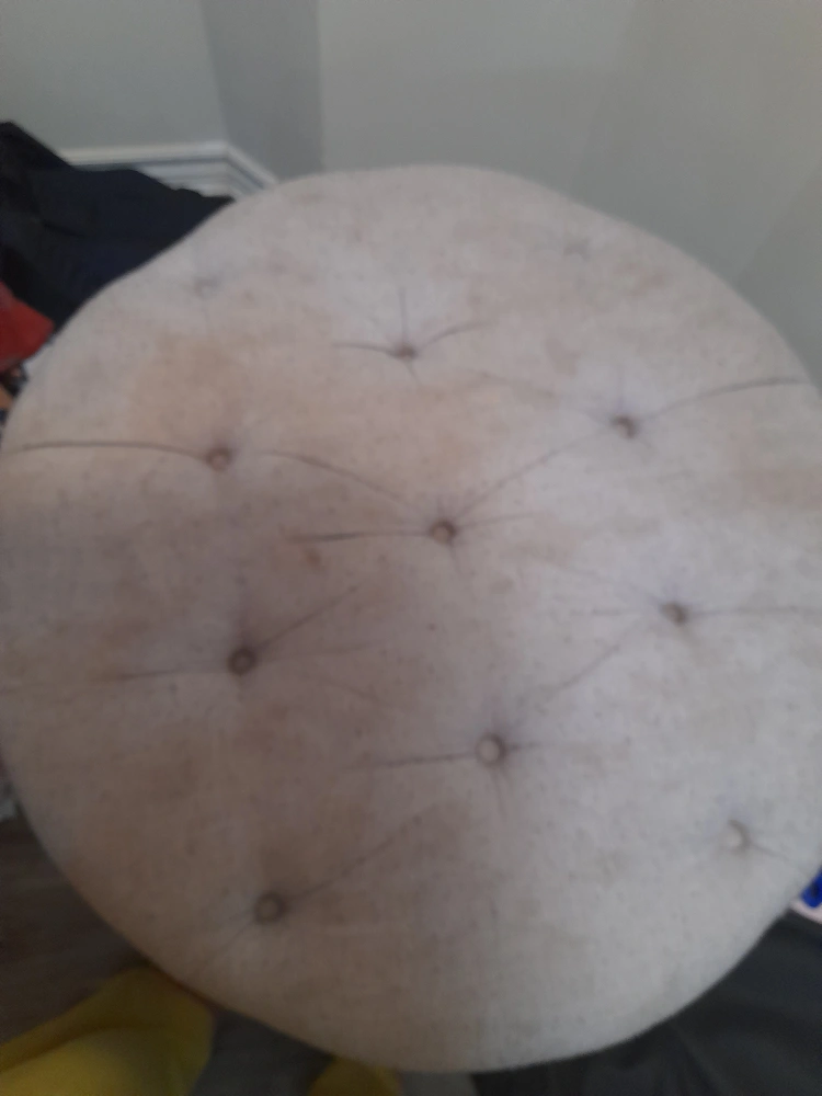 This round ottoman has a lift-up top to reveal storage space. It has a tufted top. It is in good condition.