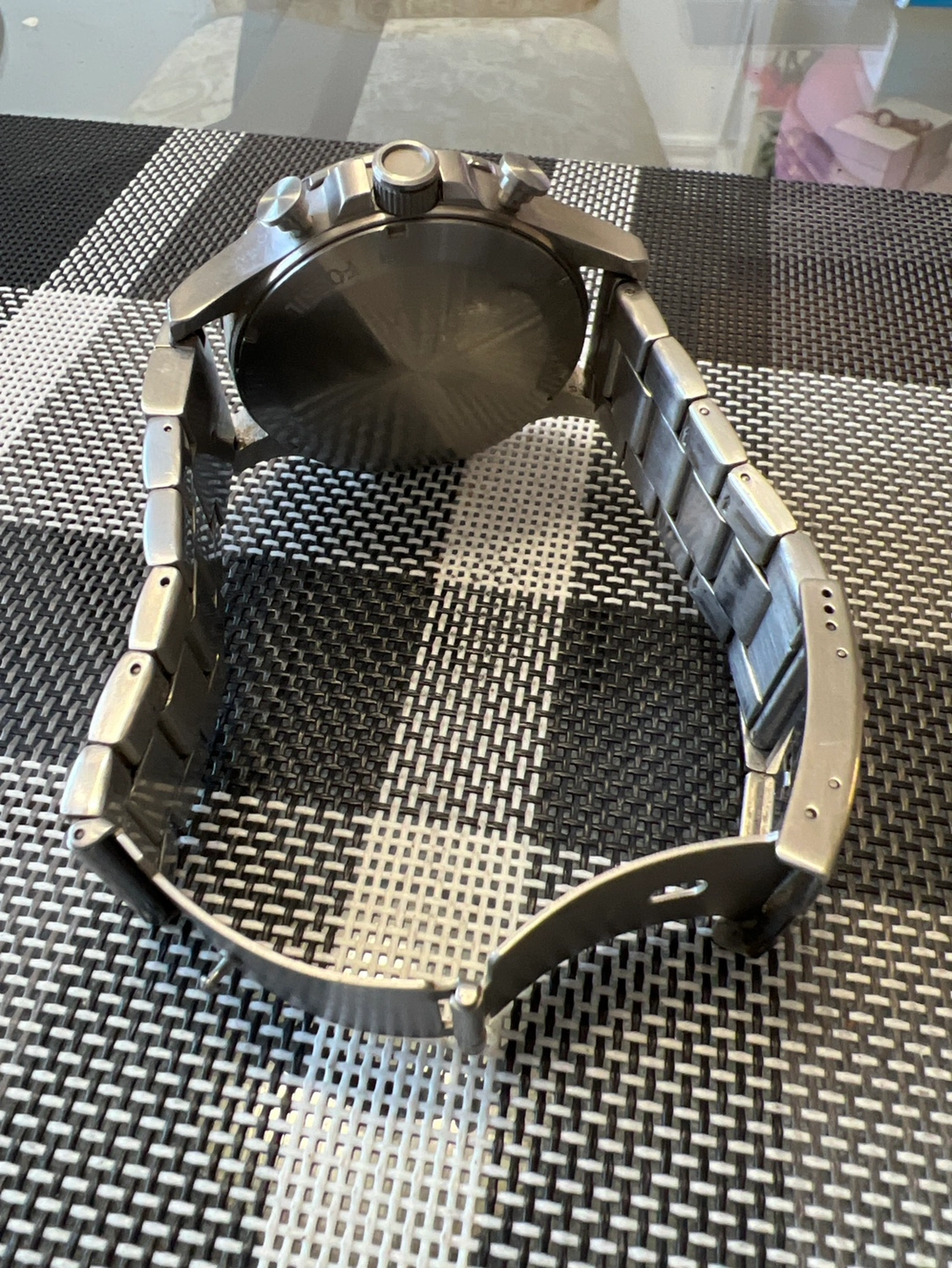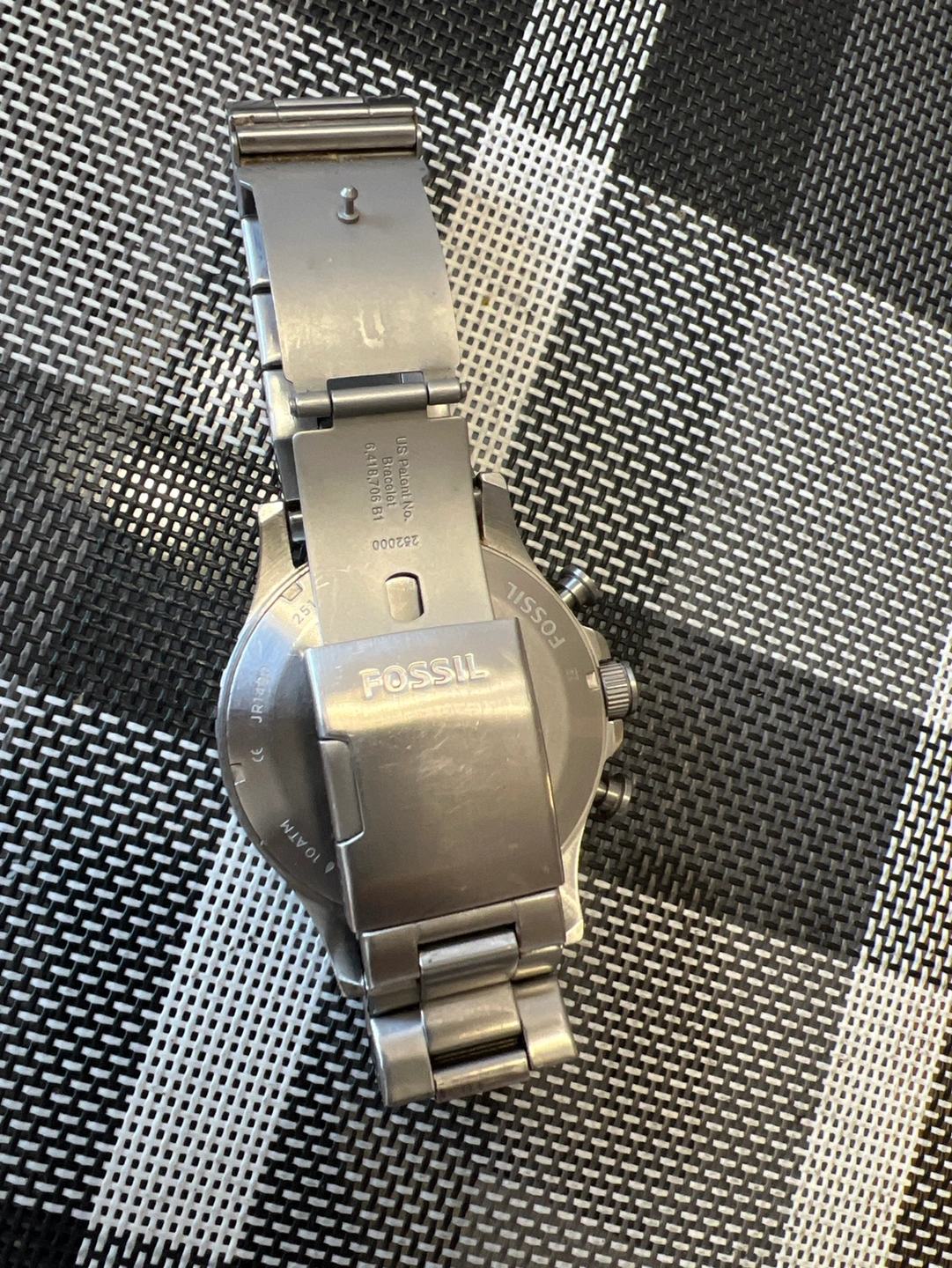 A men's Fossil watch with a black face and stainless steel band. It includes a compass on the band. Needs a battery replacement.