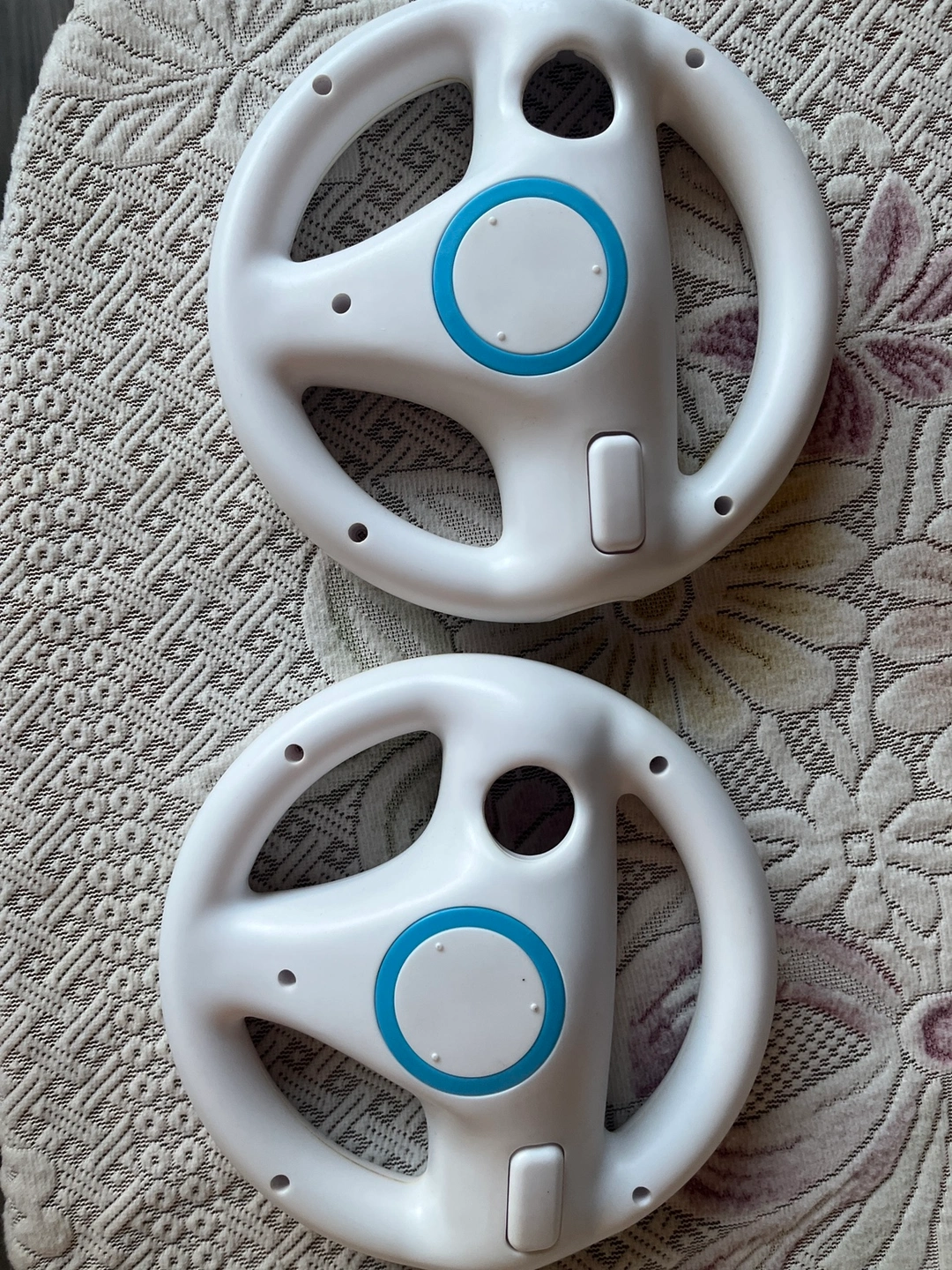 Two white Wii wheels with blue rings around the centre. They are in good condition.
