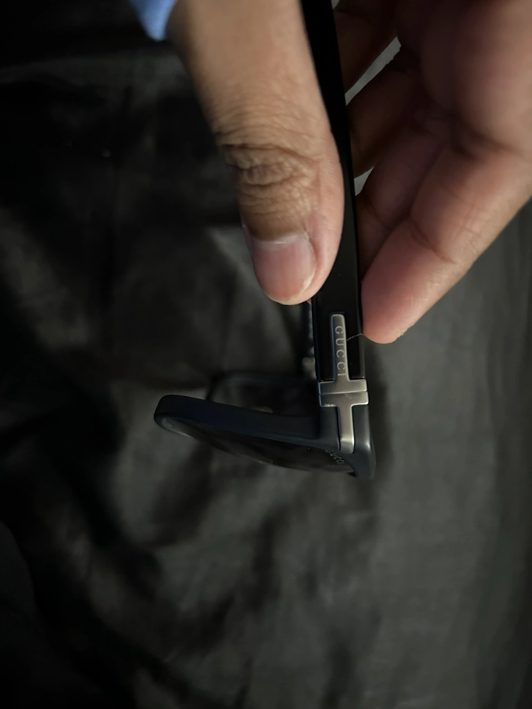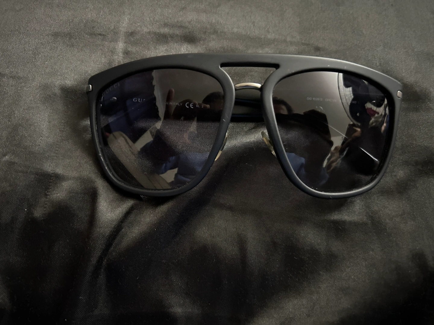 These sunglasses are black in colour with silver accents and have a square shape. Like have the aviator style. Super nice. One very minor scratch therefore price is 200. They retail for 700. Serious inquires only.