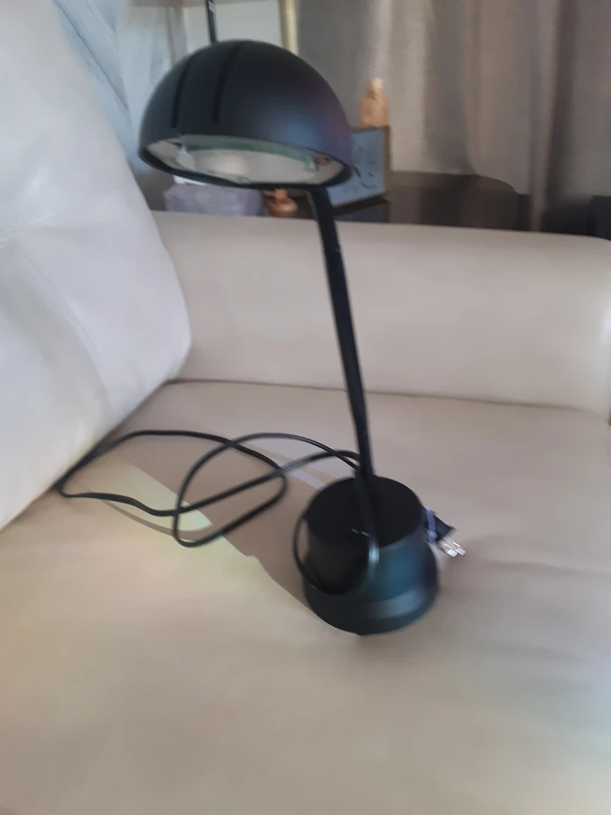This IKEA vintage halogen desk reading lamp in black is in full working condition. Low power consumption. The base is heavy enough to give it good stability, but not too heavy to move. The lamp unit itself is on a gooseneck which provides flexibility for convenient positioning of light. Though vintage, mid-90s, it looks contemporary. Downsizing for retirement.