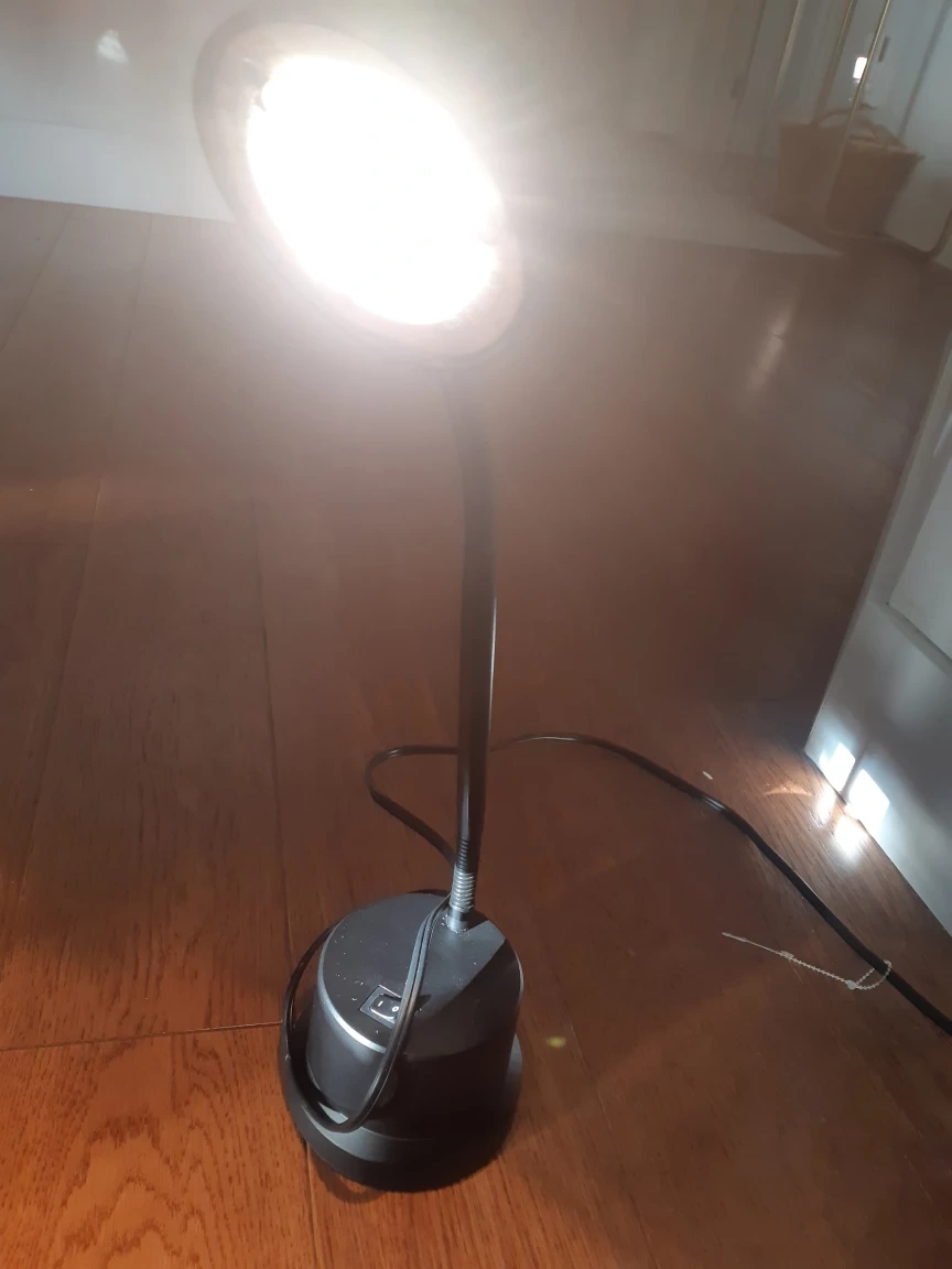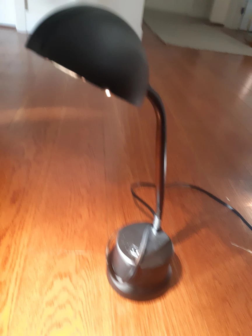 A black desk lamp with a flexible neck. The lamp is corded and has a halogen lightbulb. It has a small round base.