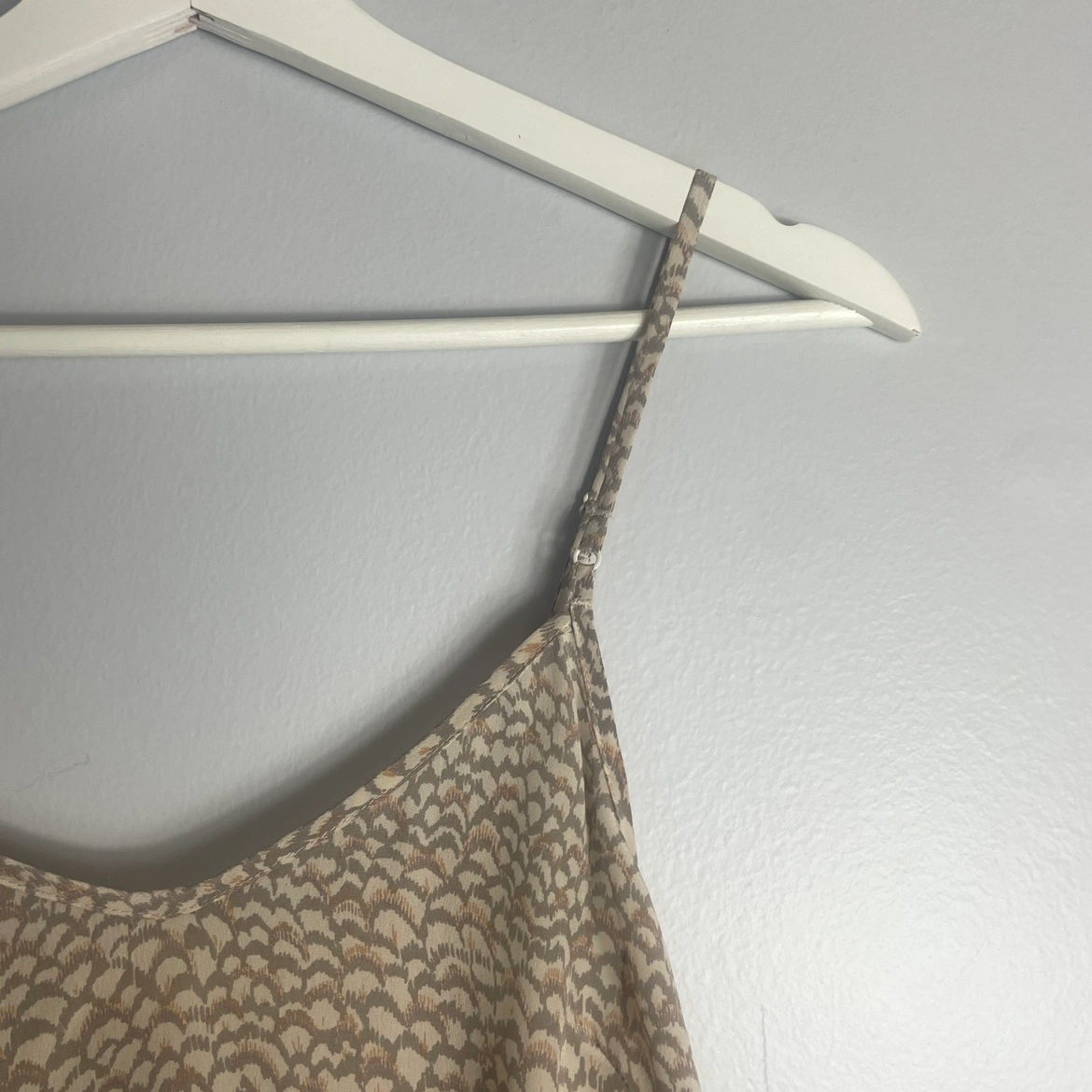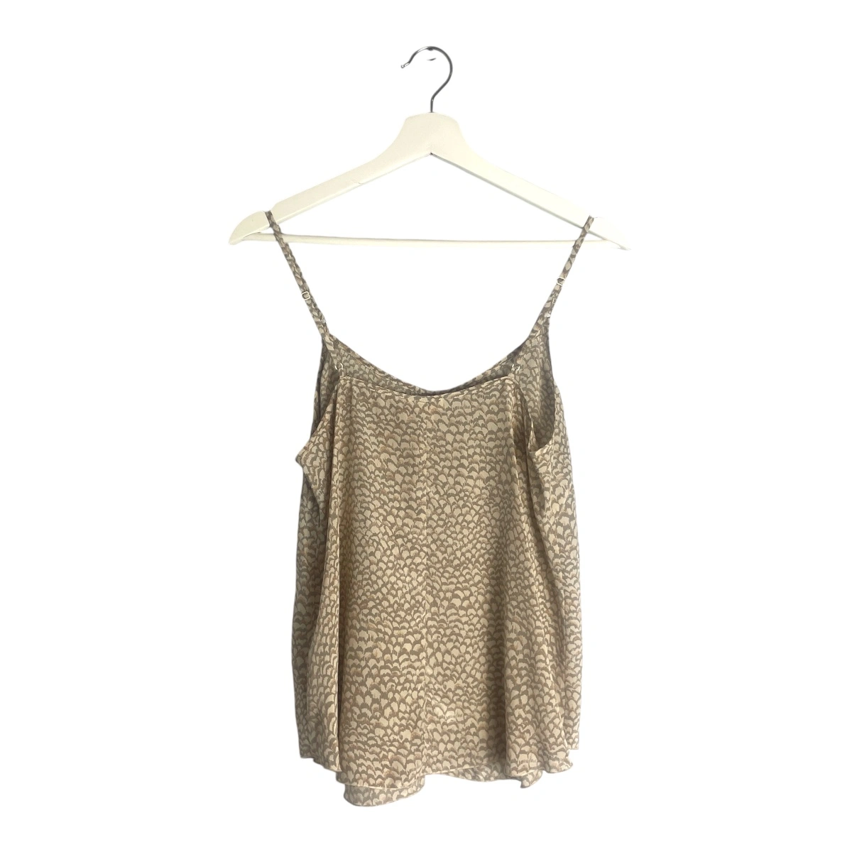 This is a V-neck camisole with darts for shaping and a curved hem. It's made from a textured, grainy 100% silk. Adjustable straps.