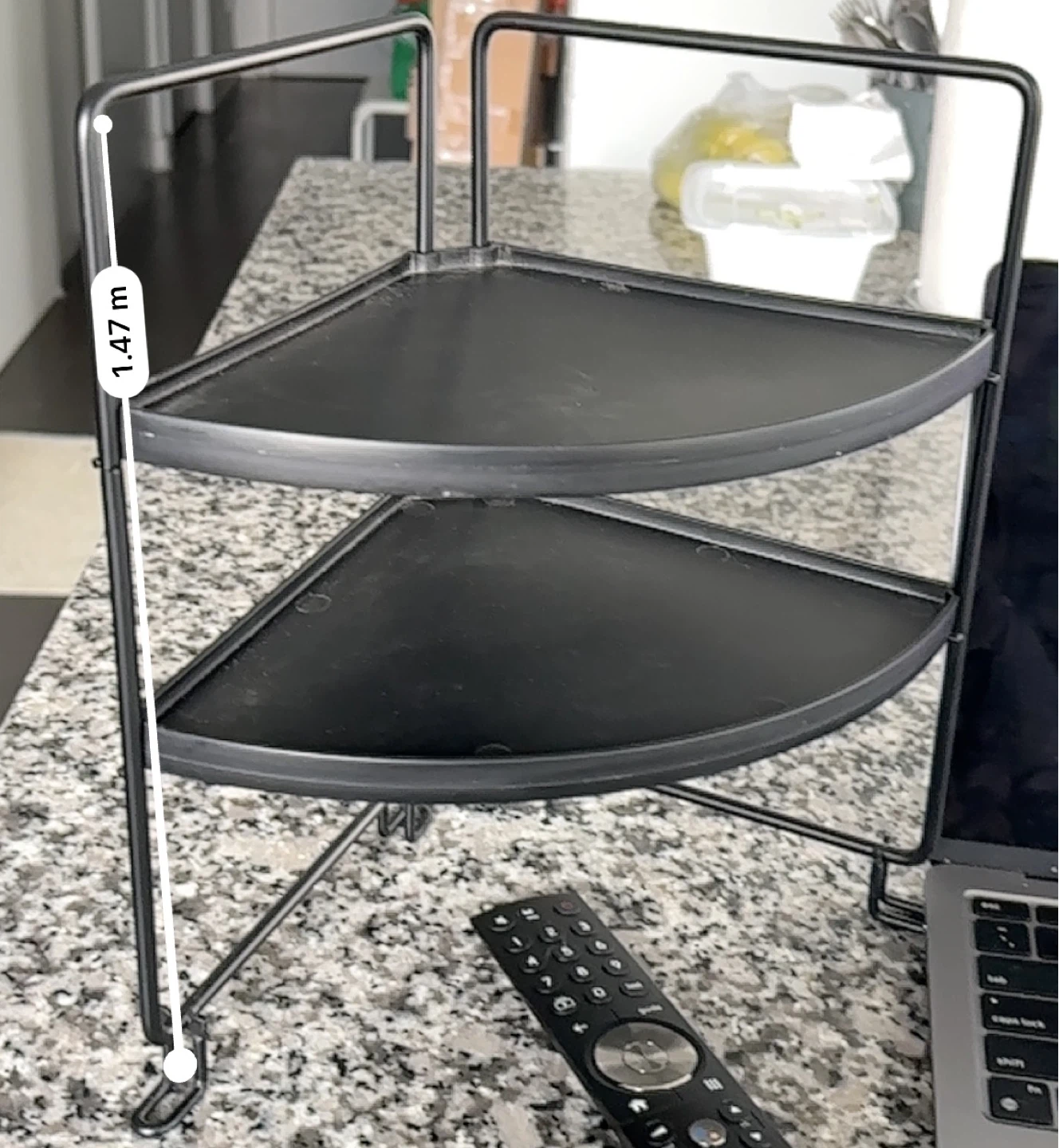 Two tier black metal shelf. Would work great in a kitchen, bathroom or other space. Selling because I bought new furniture and I don't need it anymore.