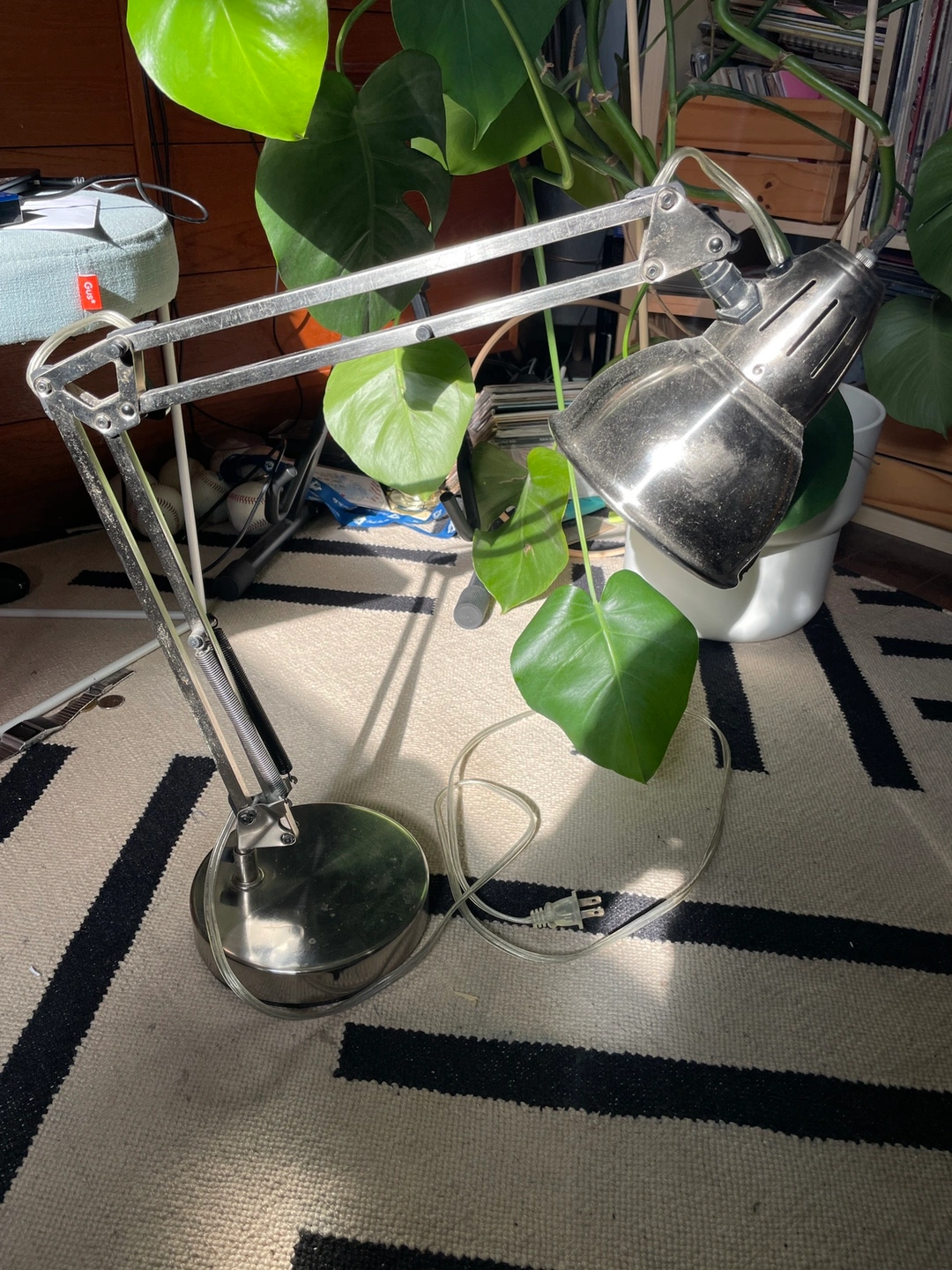 A metal desk lamp with a large, adjustable head. It has a cord and plug. Works just fine.