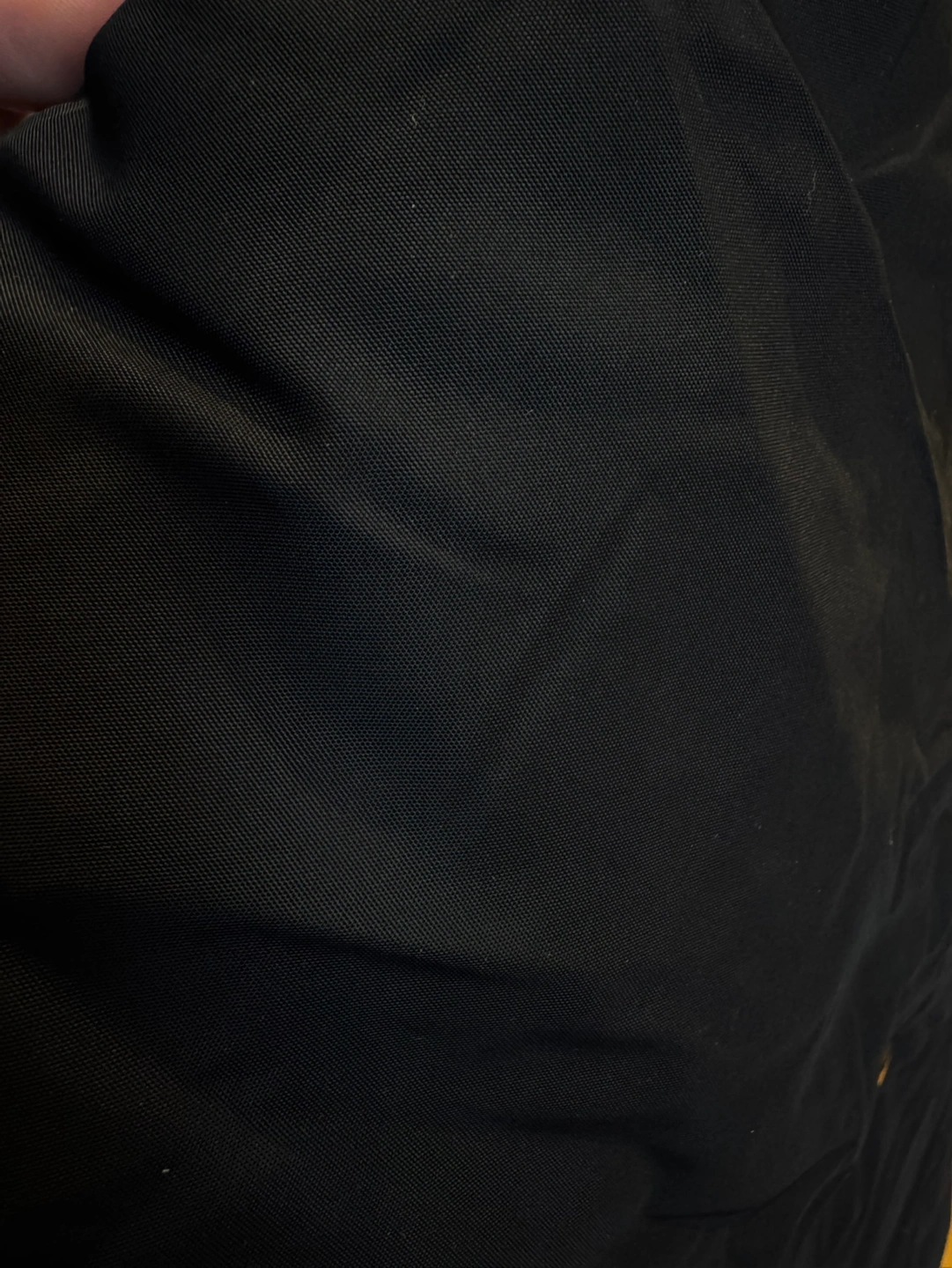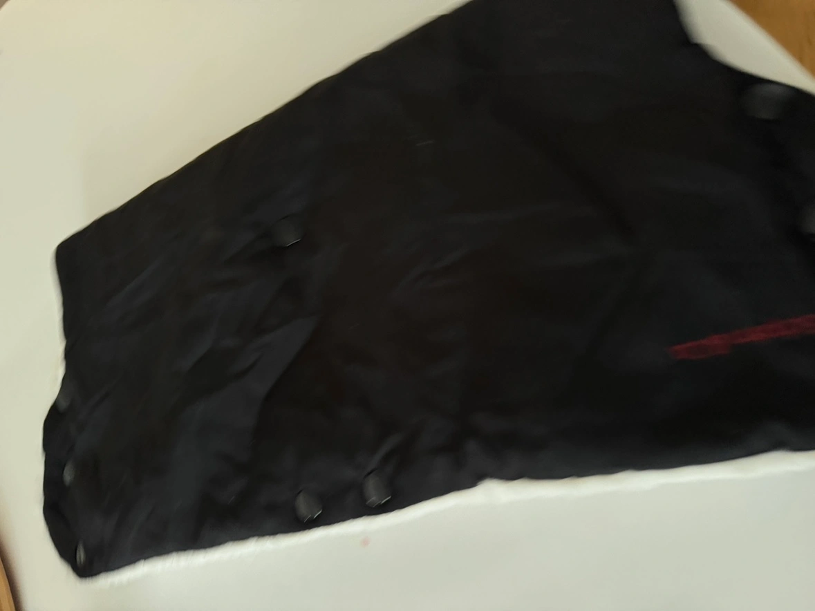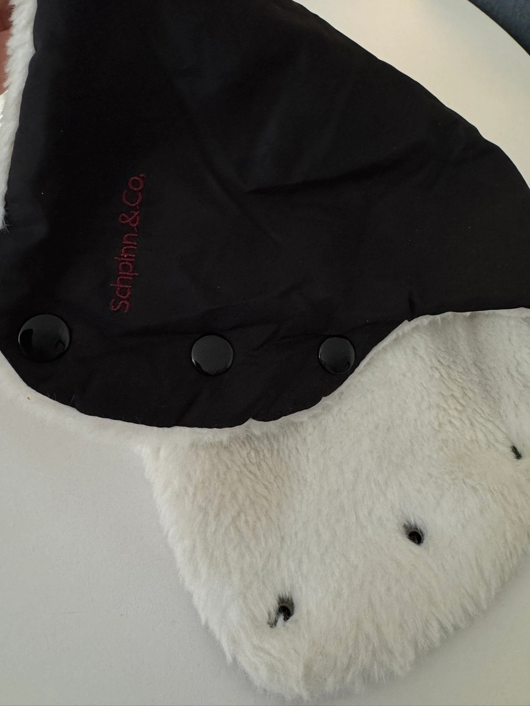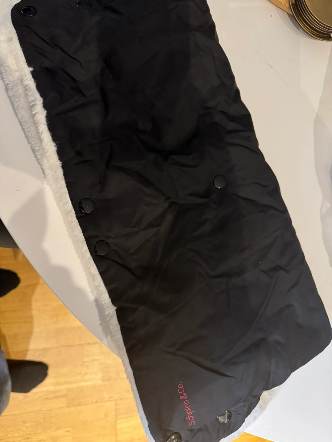 Black stroller hand muffs with white faux fur lining. They have snap buttons.